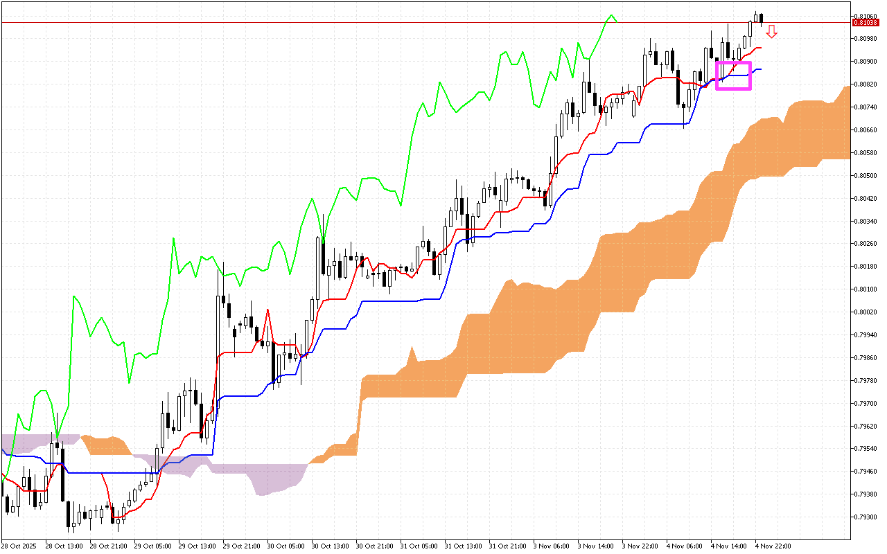 Η γραμμή Chikou, η οποία προβάλλει την τιμή κλεισίματος με μια καθυστέρηση 26 περιόδων, είναι πάνω από την τιμή.