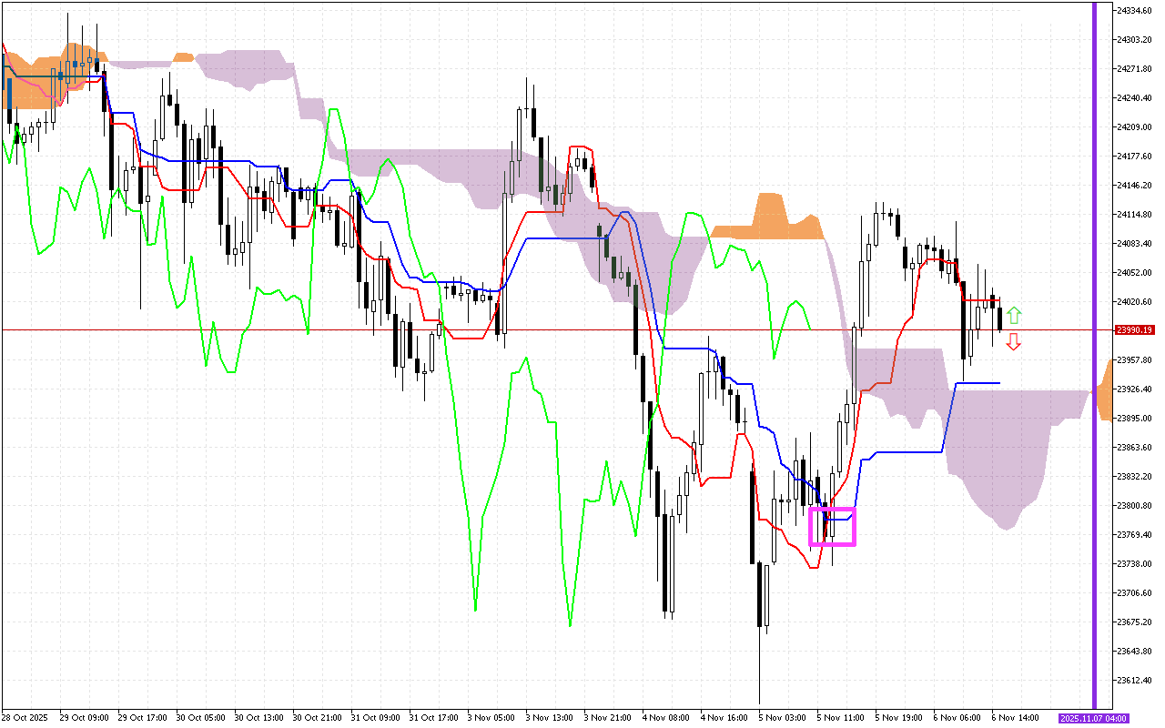 Το δεύτερο σημαντικό σήμα είναι μια αλλαγή στην κατεύθυνση κίνησης του σύννεφου Kumo. Αυτή η αλλαγή σημειώνεται με μια κατακόρυφη μωβ γραμμή στο γράφημα. Η εμφάνιση πορτοκαλί χρώματος στο σύννεφο υποδηλώνει αλλαγή της κύριας κατεύθυνσης κίνησης προς τα πάνω.