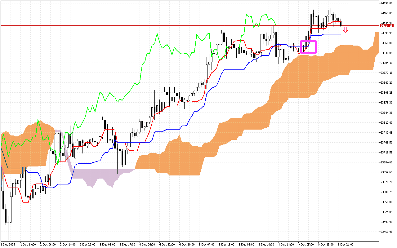Η τιμή είναι πλέον τοποθετημένη μεταξύ των γραμμών Tenkan και Kijun, υποδεικνύοντας μια προσωρινή σταθεροποίηση πριν από μια πιθανή επανάληψη της τάσης.