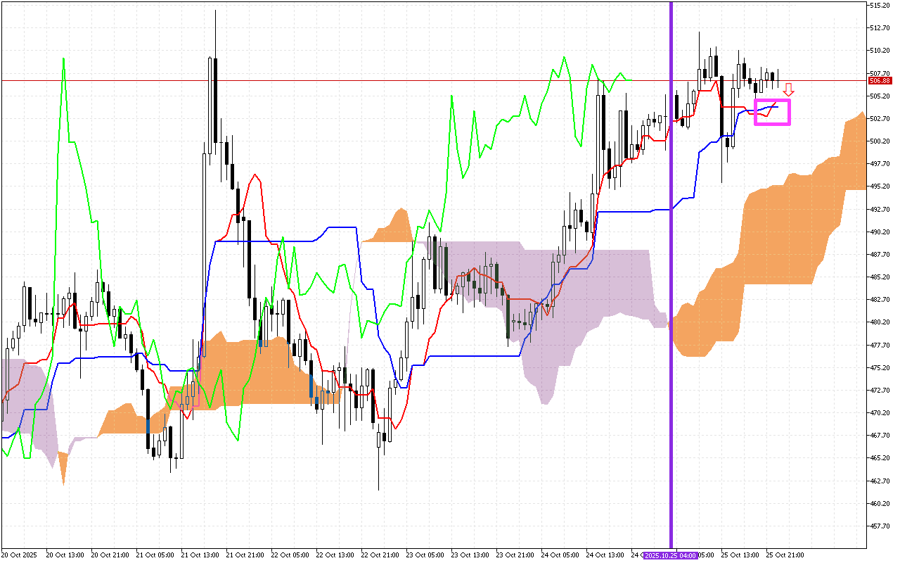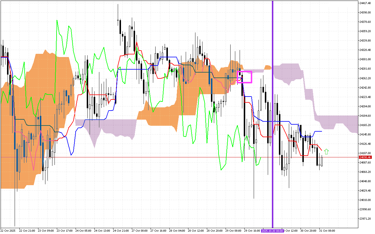 Η τιμή εισήλθε στο σύννεφο Kumo, που μπορεί να υποδηλώνει μια πιθανή αλλαγή στην τάση ή την ανάπτυξη μιας πλάγιας κίνησης. Οι γραμμές SenkouA και SenkouB λειτουργούν ως υποστήριξη και αντίσταση. Για να διευκρινιστεί η κατάσταση, αξίζει η αναμονή μέχρι να διορθωθεί η τιμή εκτός του cloud.