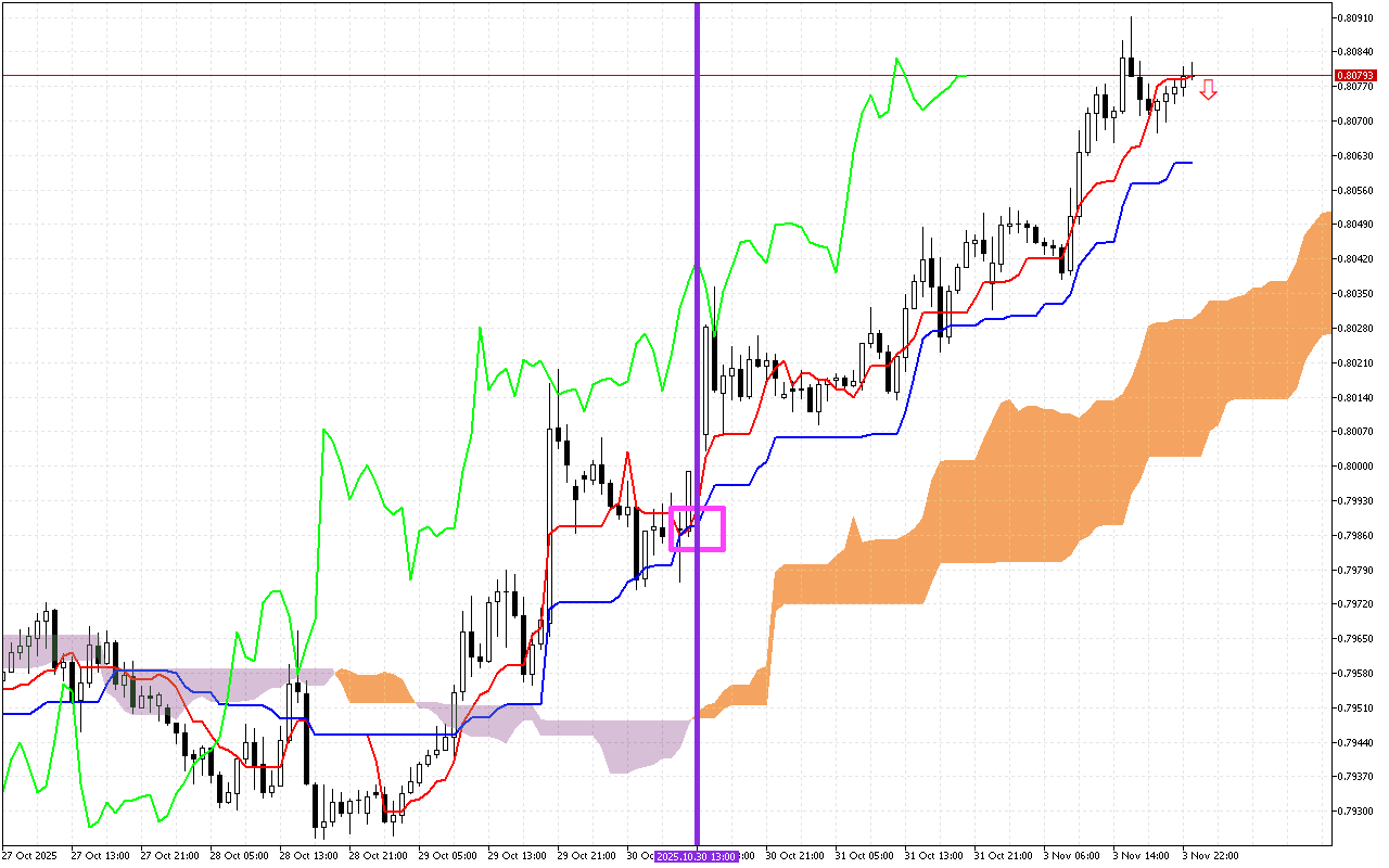 Το δεύτερο πιο σημαντικό σήμα είναι μια αλλαγή στην κατεύθυνση κίνησης του νέφους Kumo. Αυτό το σήμα σημειώνεται στο γράφημα με μια κατακόρυφη μωβ γραμμή. Το πορτοκαλί χρώμα του σύννεφου υποδηλώνει αλλαγή στην κατεύθυνση προτεραιότητας της κίνησης προς τα πάνω.