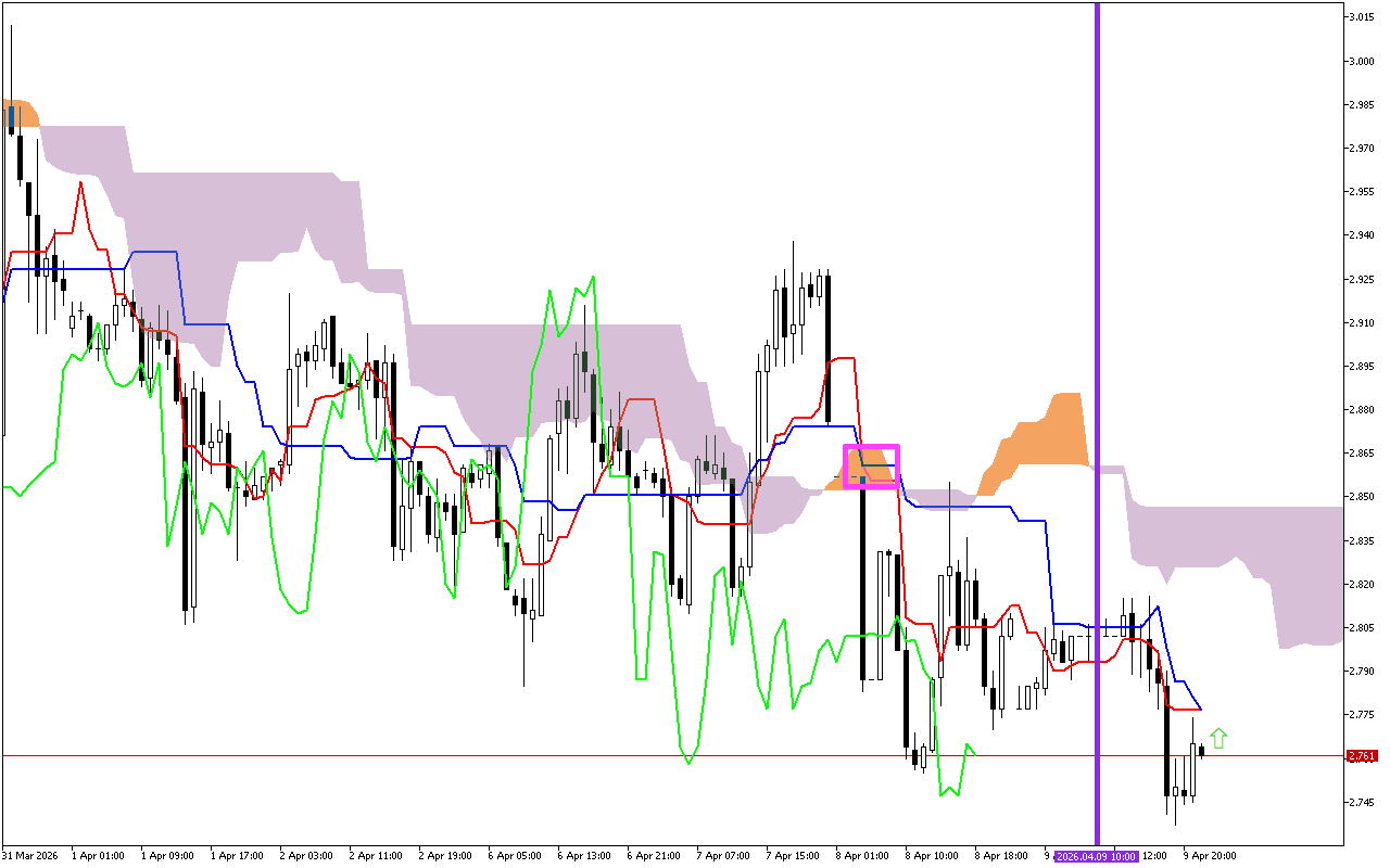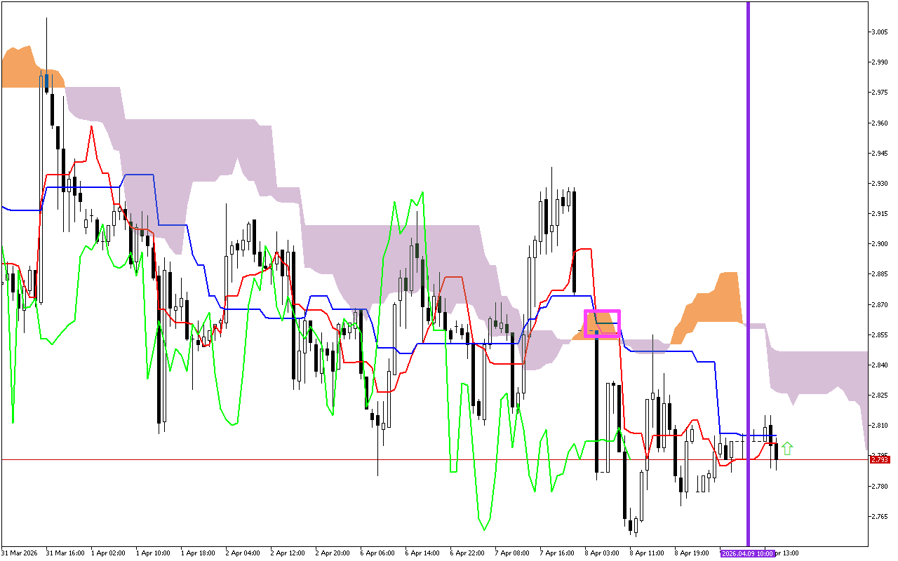 Η τιμή είναι μεταξύ των γραμμών SenkouA και SenkouB. Αντίστοιχα, τώρα αυτές οι γραμμές παίζουν το ρόλο των επιπέδων στήριξης και αντίστασης. Για να διευκρινιστεί η κατάσταση, αξίζει να περιμένουμε να προχωρήσει η τιμή πέρα από το νέφος Kumo.