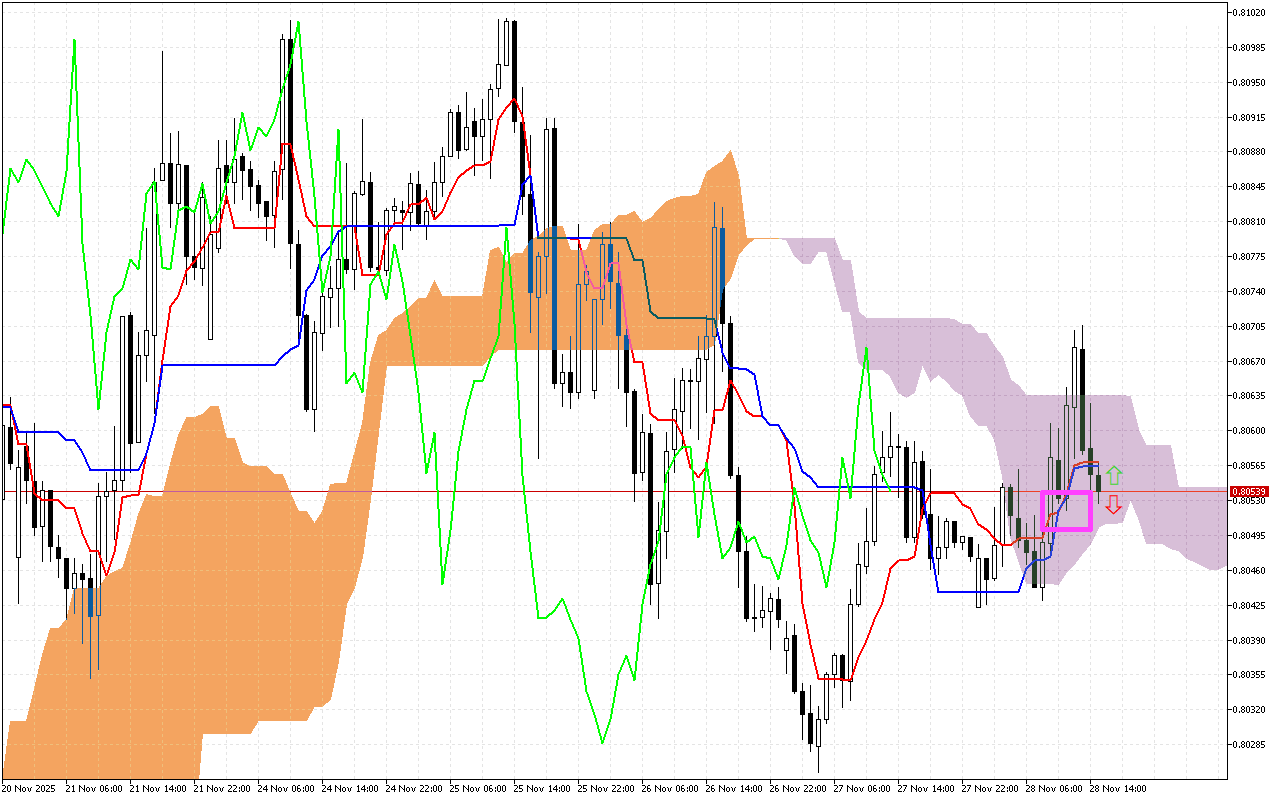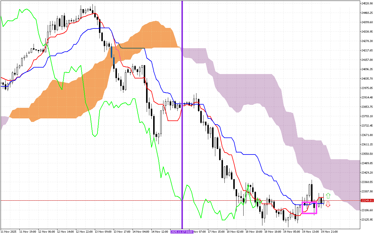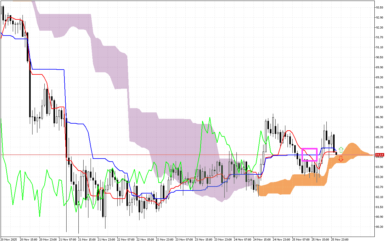 Η κύρια στιγμή των προηγούμενων συνεδριάσεων συναλλαγών ήταν η διασταύρωση των γραμμών Tenkan και Kijun. Αυτό το σήμα σημειώνεται στο γράφημα με ένα ροζ τετράγωνο και υποδηλώνει μια αλλαγή της τάσης σε πτωτική. Ωστόσο, στη συνέχεια είδαμε την τιμή να αυξάνεται πάνω από το Tenkan, υποδηλώνοντας αδυναμία στην καθοδική δυναμική.