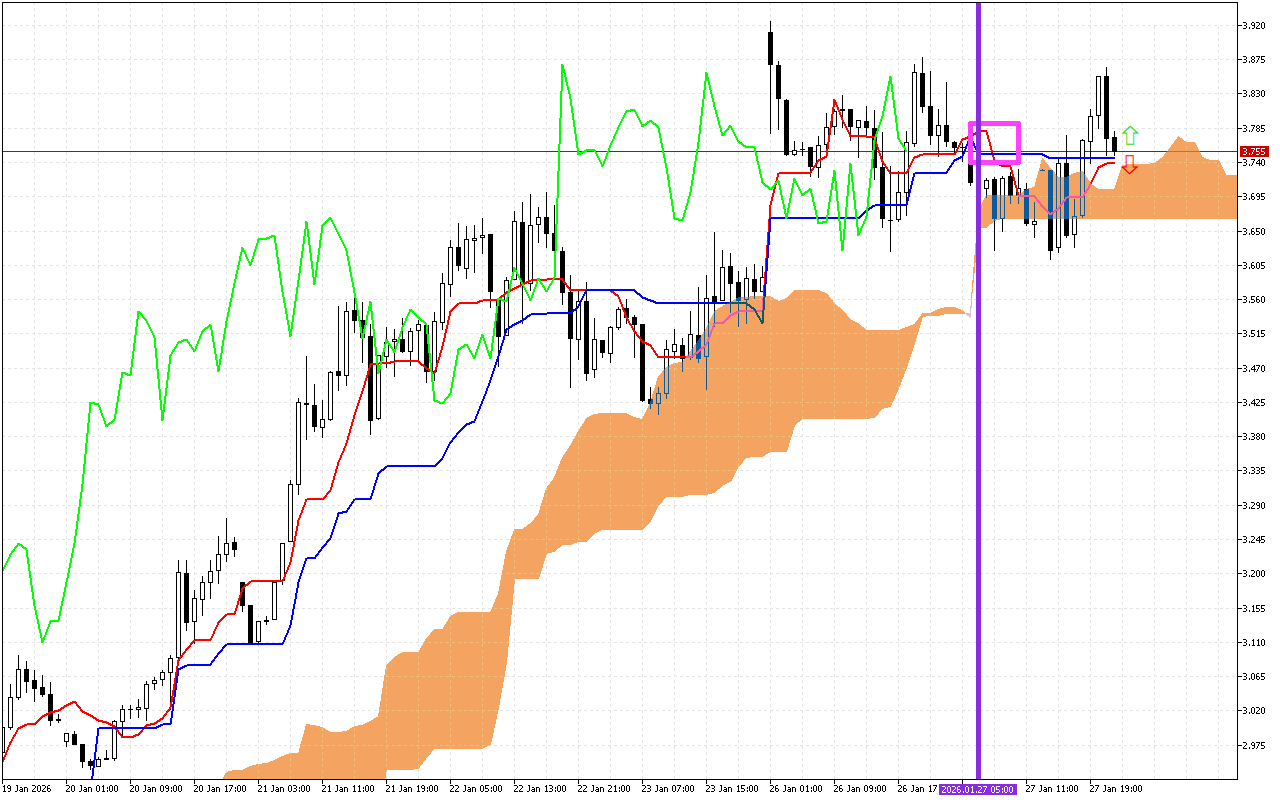 Το δεύτερο σημαντικό σήμα είναι μια αλλαγή στην κατεύθυνση κίνησης του σύννεφου Kumo. Αυτή η αλλαγή σημειώνεται με μια κατακόρυφη μωβ γραμμή στο γράφημα. Η εμφάνιση πορτοκαλί χρώματος στο σύννεφο υποδηλώνει αλλαγή της κύριας κατεύθυνσης κίνησης προς τα πάνω.