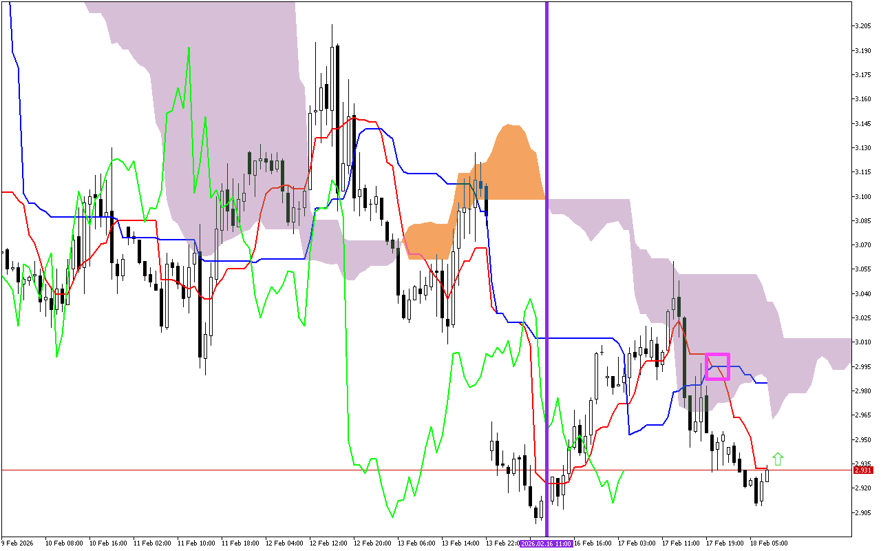 Το δεύτερο σημαντικό σήμα είναι μια αλλαγή στην κατεύθυνση κίνησης του σύννεφου Kumo. Αυτή η αλλαγή σημειώνεται με μια κατακόρυφη μωβ γραμμή στο γράφημα. Η εμφάνιση πορτοκαλί χρώματος στο σύννεφο υποδηλώνει αλλαγή της κύριας κατεύθυνσης κίνησης προς τα πάνω.