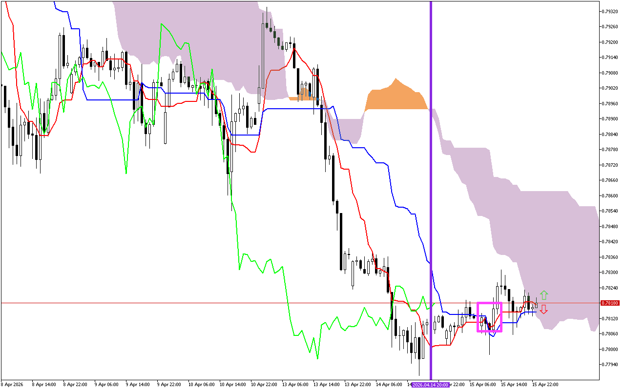 Το δεύτερο σημαντικό σήμα είναι μια αλλαγή στην κατεύθυνση κίνησης του σύννεφου Kumo. Αυτή η αλλαγή σημειώνεται με μια κατακόρυφη μωβ γραμμή στο γράφημα. Η εμφάνιση πορτοκαλί χρώματος στο σύννεφο υποδηλώνει αλλαγή της κύριας κατεύθυνσης κίνησης προς τα πάνω.
