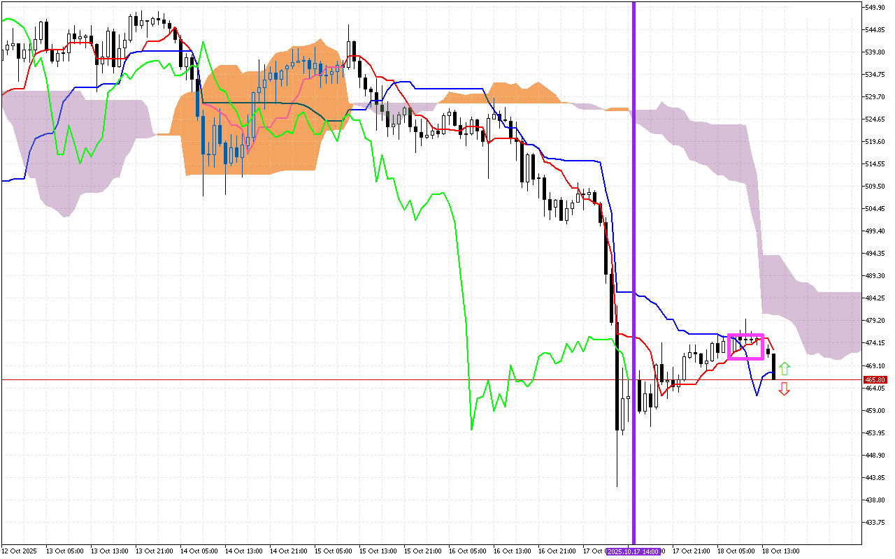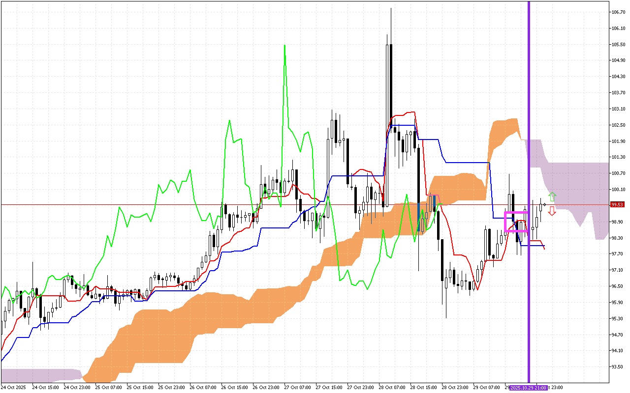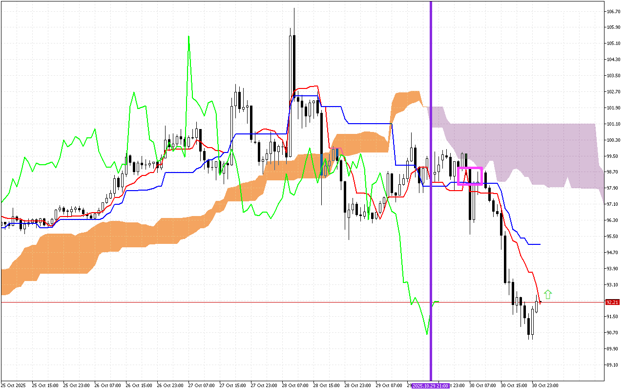 Το σύννεφο Kumo είναι χρωματισμένο λιλά, το οποίο υποδεικνύει την προτεραιότητα του καθοδικού διανύσματος της κίνησης των τιμών.