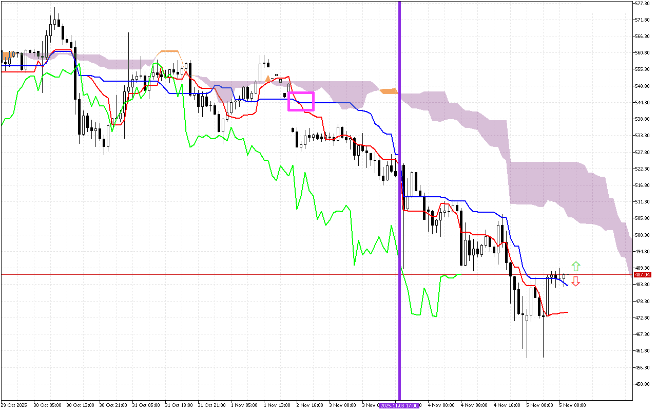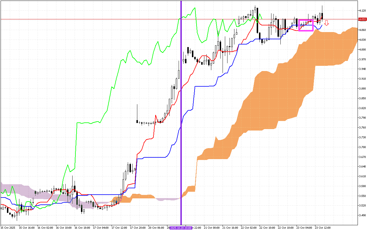 Το δεύτερο πιο σημαντικό σήμα είναι η αλλαγή κατεύθυνσης του νέφους Kumo, που σημειώνεται με μια κατακόρυφη μωβ γραμμή. Μια αλλαγή στο χρώμα του σύννεφου σε λιλά υποδηλώνει μια μετάβαση της κατεύθυνσης προτεραιότητας της κίνησης προς τα κάτω.