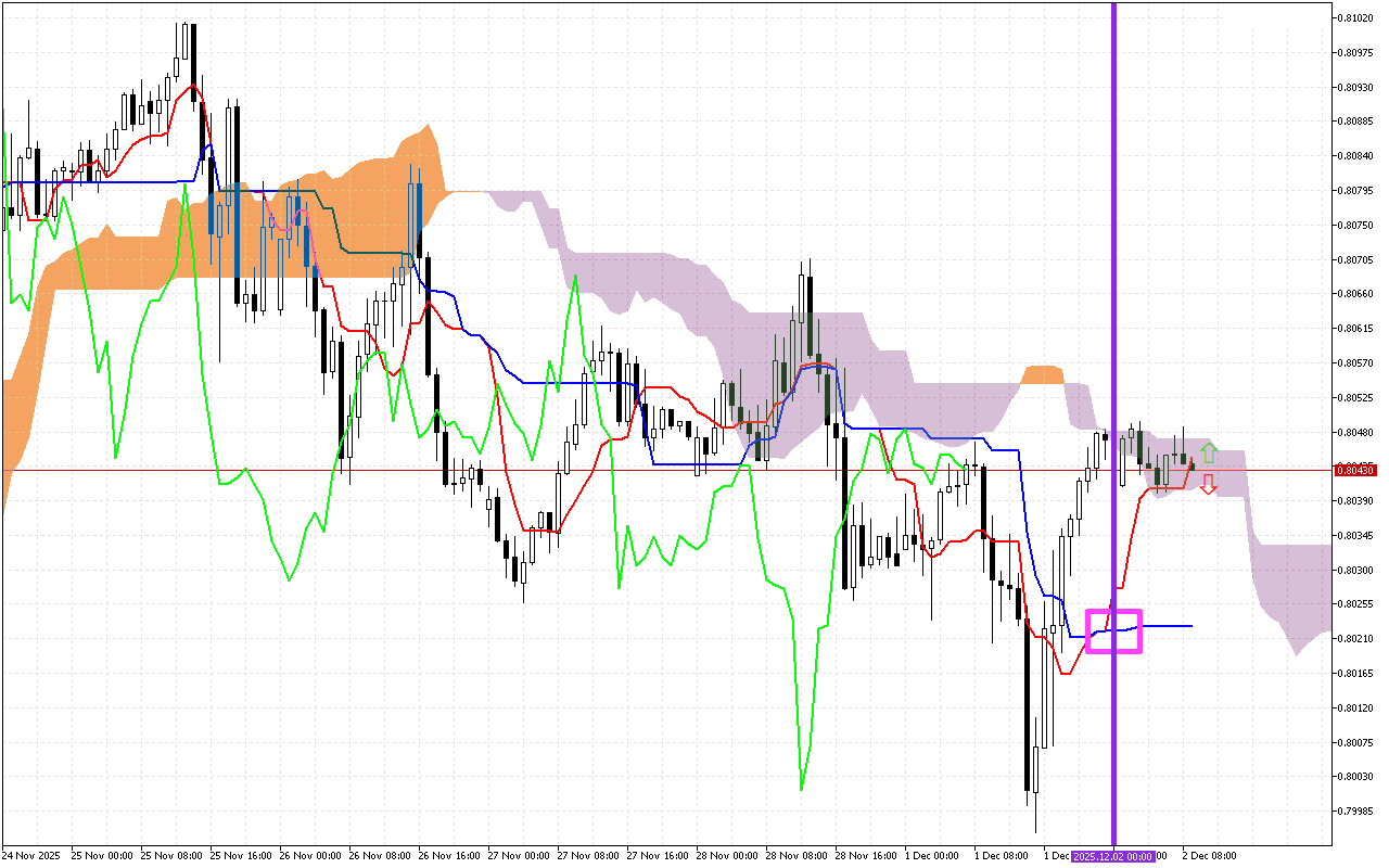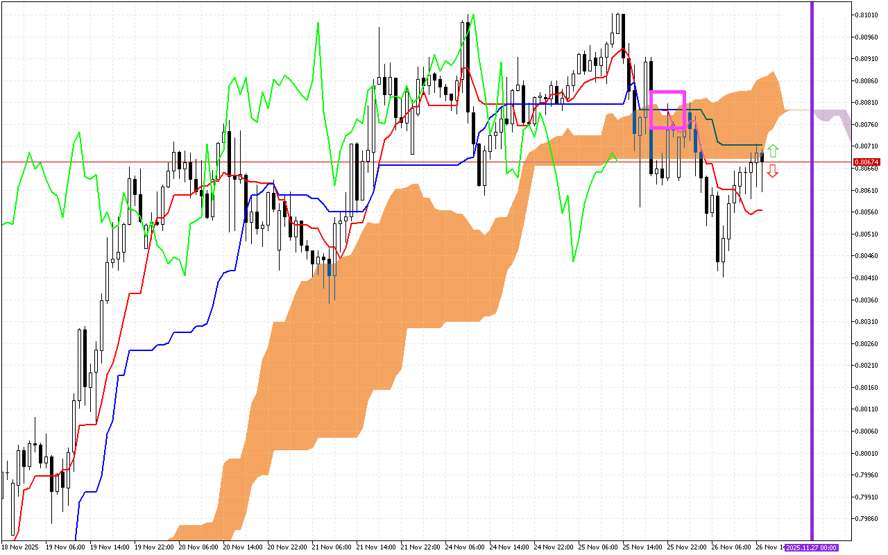 Η τιμή είναι πλέον τοποθετημένη μεταξύ των γραμμών Tenkan και Kijun, υποδεικνύοντας μια προσωρινή σταθεροποίηση πριν από μια πιθανή επανάληψη της τάσης.