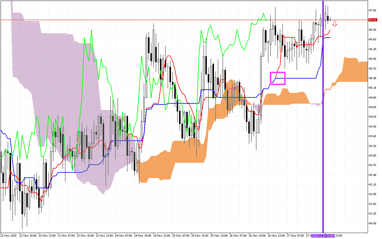 Το δεύτερο πιο σημαντικό σήμα είναι μια αλλαγή στην κατεύθυνση κίνησης του νέφους Kumo. Αυτό το σήμα σημειώνεται στο γράφημα με μια κατακόρυφη μωβ γραμμή. Το πορτοκαλί χρώμα του σύννεφου υποδηλώνει αλλαγή στην κατεύθυνση προτεραιότητας της κίνησης προς τα πάνω.