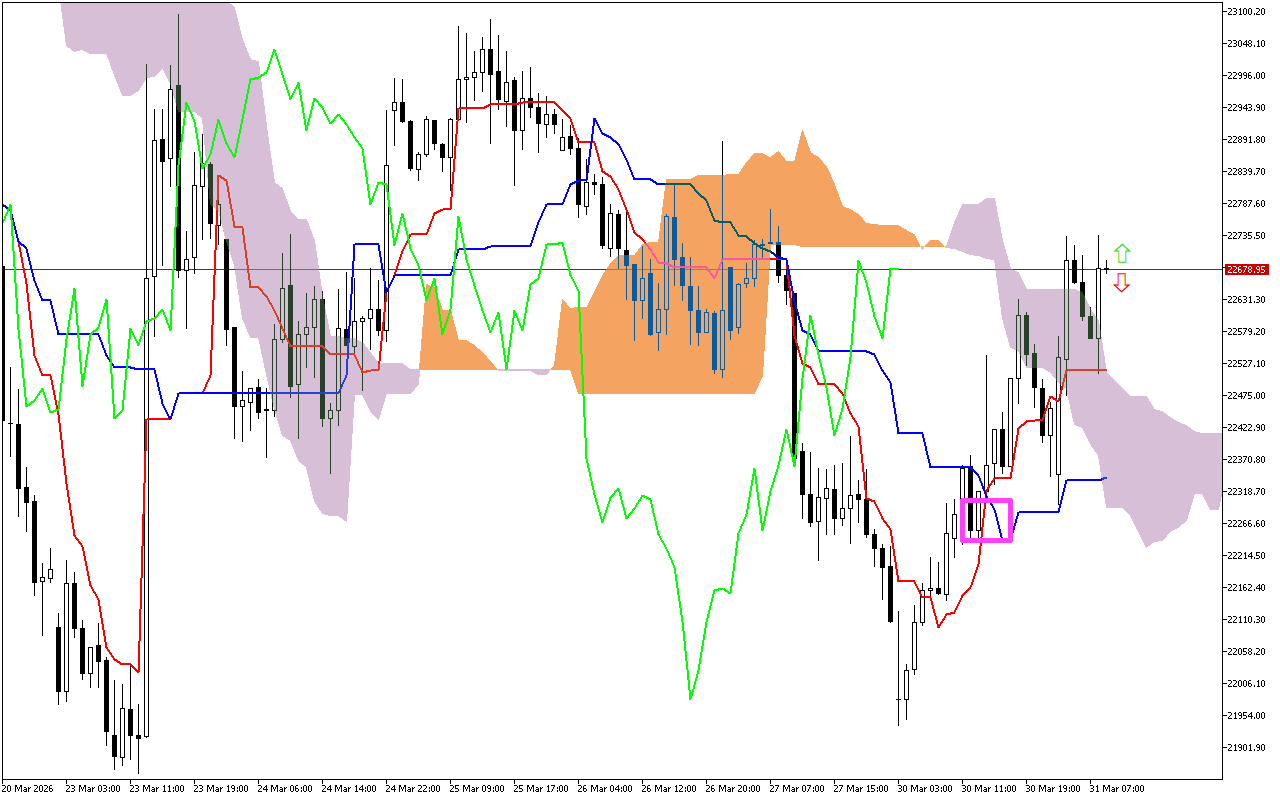 Τα δυναμικά επίπεδα υποστήριξης βρίσκονται στη γραμμή Kijun, κοντά στο 23047.13, τη γραμμή SenkouA, στο 23101.40 και τη γραμμή SenkouB, κοντά στο 22855.78.