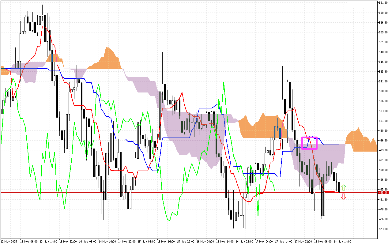 Στο τρέχον προφίλ της αγοράς, η τιμή έχει ενοποιηθεί κάτω από το νέφος Kumo. Τα όρια του νέφους σχηματίζουν μια ζώνη δυναμικής αντίστασης για την τιμή.