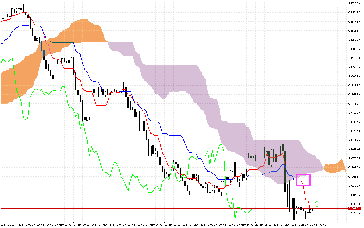 Το δεύτερο σημαντικό σήμα είναι μια αλλαγή στο χρώμα του μπλοκ σύννεφου Kumo, το οποίο επισημαίνεται στο γράφημα με μια κατακόρυφη μωβ γραμμή. Η εμφάνιση ενός λιλά χρώματος στο σύννεφο υποδηλώνει αλλαγή στην κατεύθυνση προτεραιότητας της κίνησης προς τα κάτω.