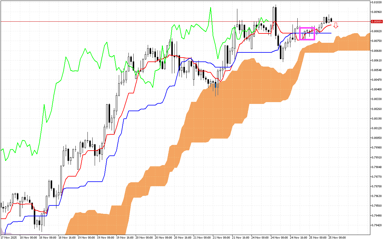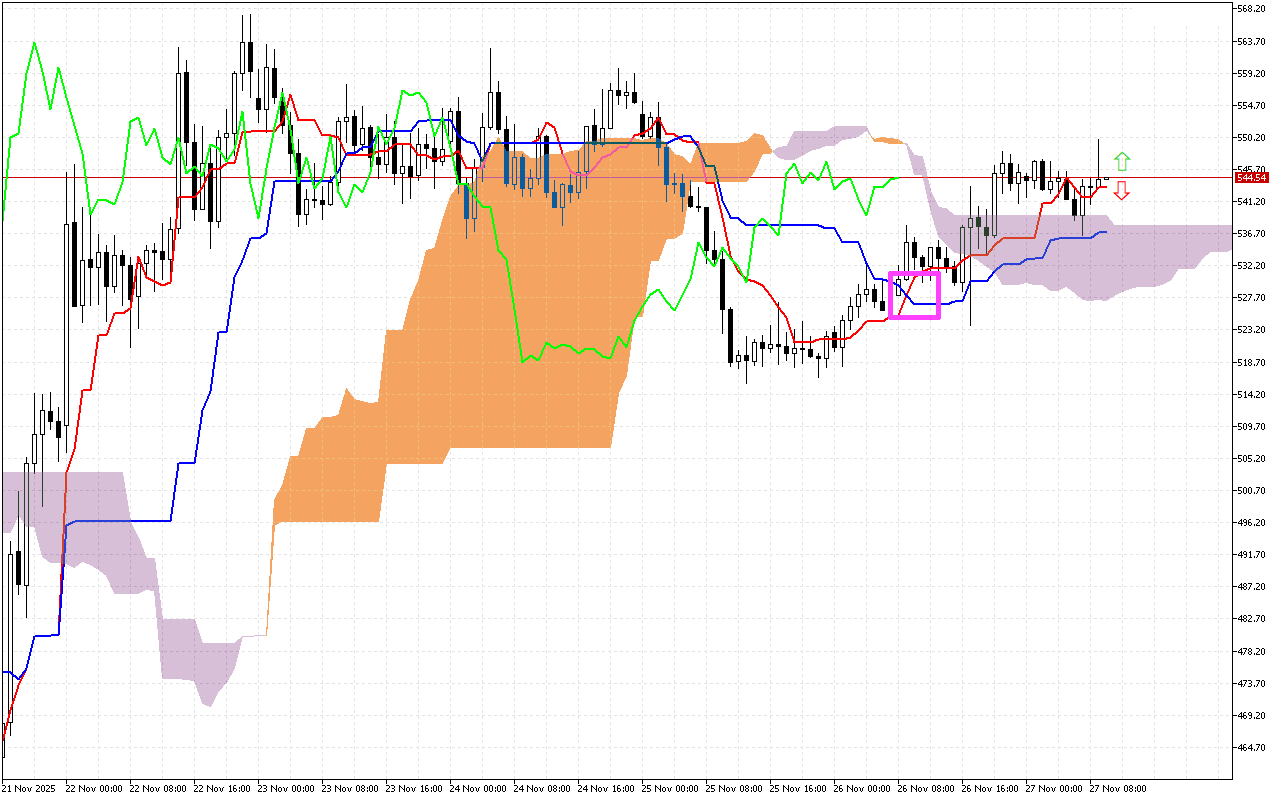 Η γραμμή Chikou, η οποία προβάλλει την τιμή κλεισίματος με μια καθυστέρηση 26 περιόδων, είναι πάνω από την τιμή.