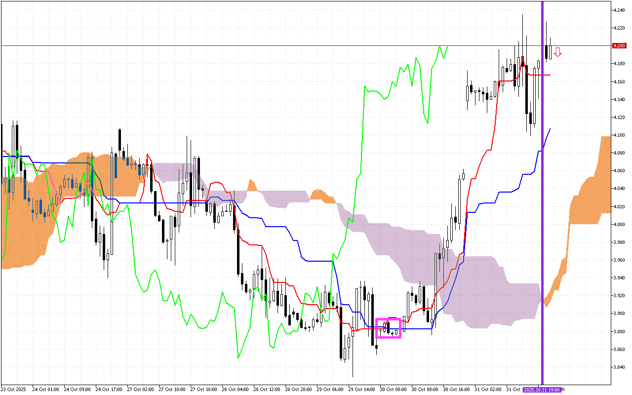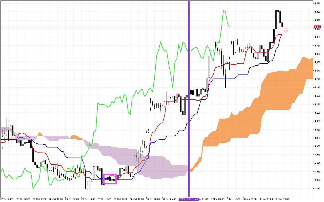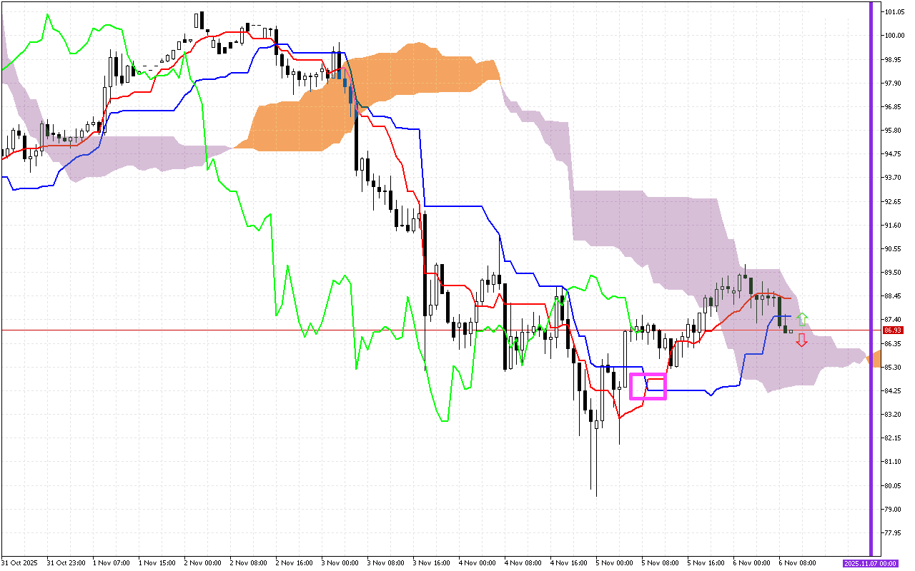 Το δεύτερο πιο σημαντικό σήμα είναι μια αλλαγή στην κατεύθυνση κίνησης του νέφους Kumo. Αυτό το σήμα σημειώνεται στο γράφημα με μια κατακόρυφη μωβ γραμμή. Το πορτοκαλί χρώμα του σύννεφου υποδηλώνει αλλαγή στην κατεύθυνση προτεραιότητας της κίνησης προς τα πάνω.