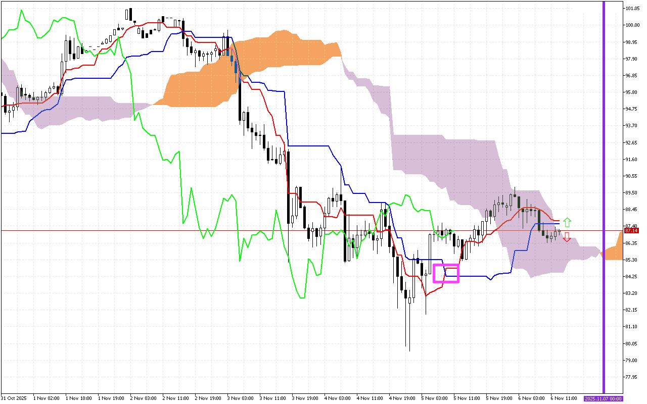 Το δεύτερο σημαντικό σήμα είναι μια αλλαγή στην κατεύθυνση κίνησης του σύννεφου Kumo. Αυτή η αλλαγή σημειώνεται με μια κατακόρυφη μωβ γραμμή στο γράφημα. Η εμφάνιση πορτοκαλί χρώματος στο σύννεφο υποδηλώνει αλλαγή της κύριας κατεύθυνσης κίνησης προς τα πάνω.