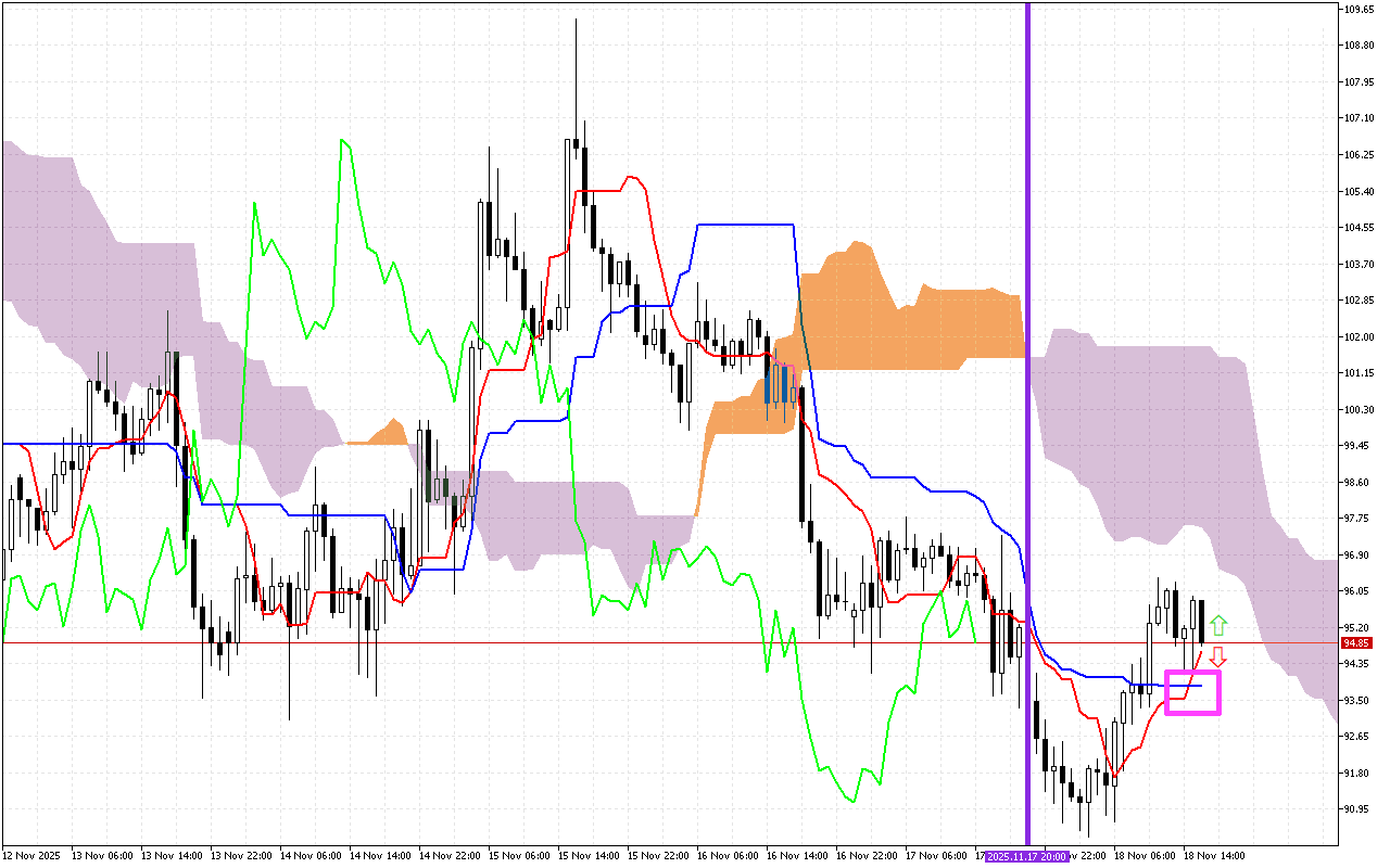Το δεύτερο πιο σημαντικό σήμα είναι μια αλλαγή στην κατεύθυνση κίνησης του νέφους Kumo. Αυτό το σήμα σημειώνεται στο γράφημα με μια κατακόρυφη μωβ γραμμή. Το πορτοκαλί χρώμα του σύννεφου υποδηλώνει αλλαγή στην κατεύθυνση προτεραιότητας της κίνησης προς τα πάνω.