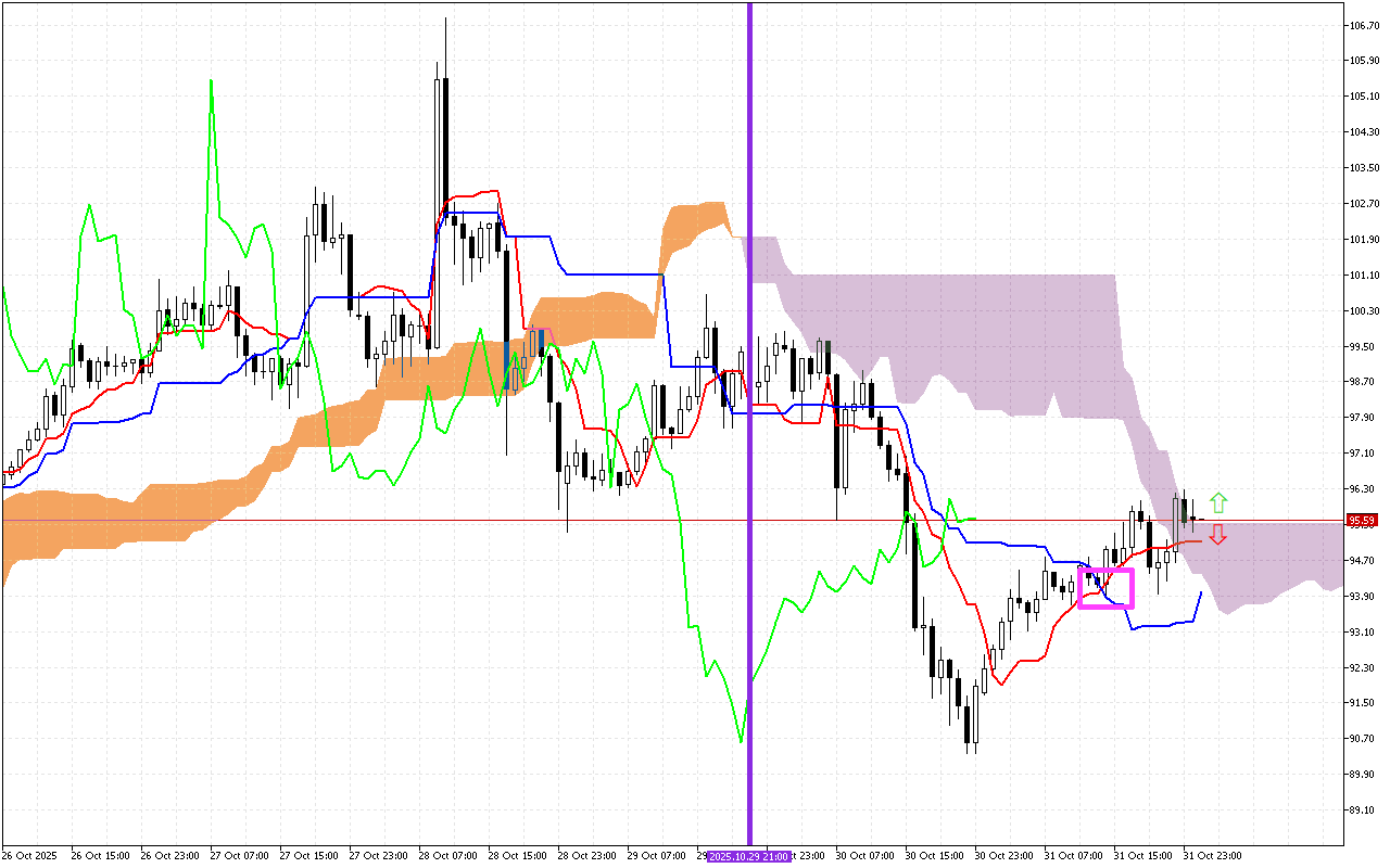 Το δεύτερο σημαντικό σήμα είναι μια αλλαγή στην κατεύθυνση κίνησης του σύννεφου Kumo. Αυτή η αλλαγή σημειώνεται με μια κατακόρυφη μωβ γραμμή στο γράφημα. Η εμφάνιση πορτοκαλί χρώματος στο σύννεφο υποδηλώνει αλλαγή της κύριας κατεύθυνσης κίνησης προς τα πάνω.