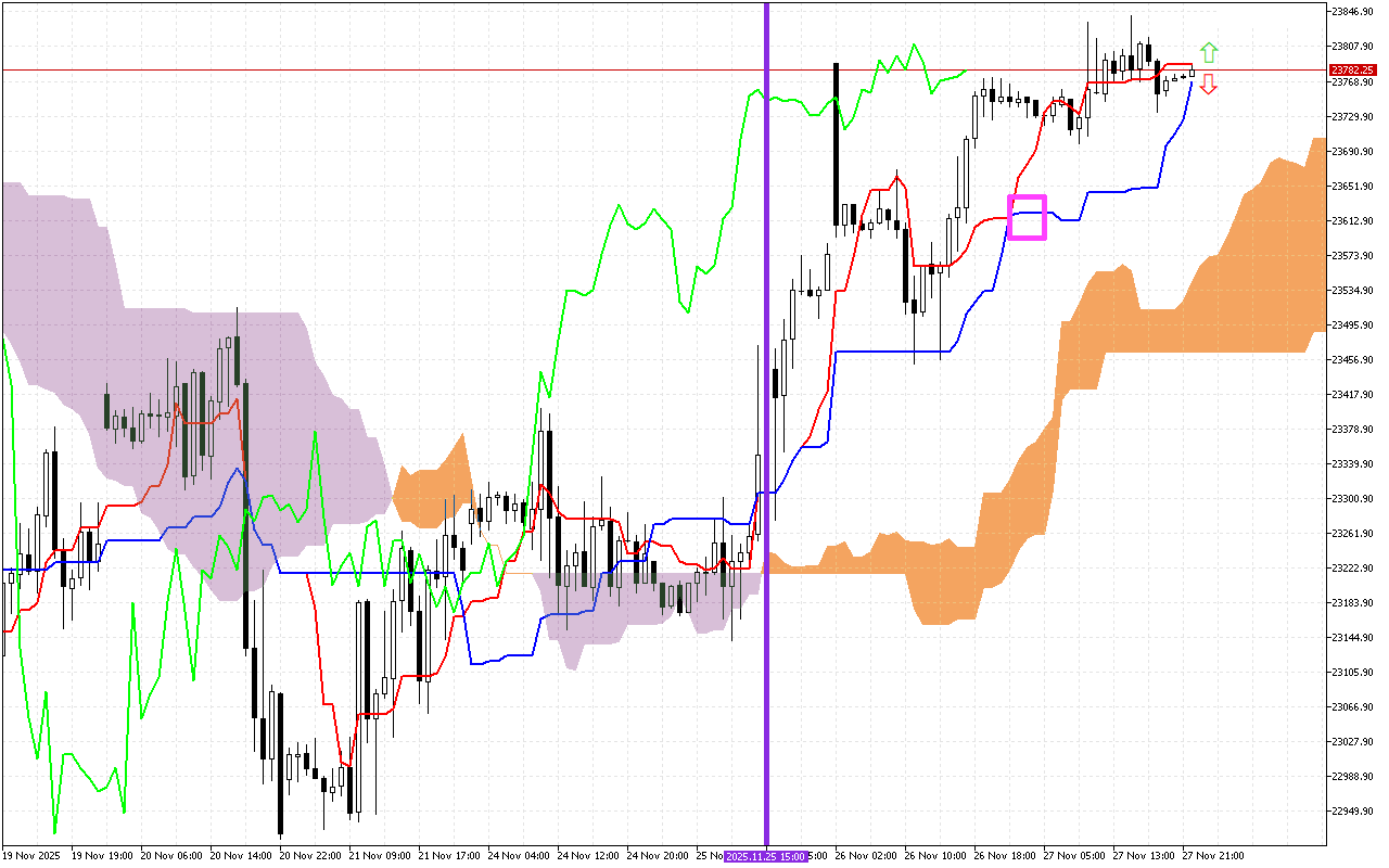 Οι δυναμικές της κίνησης των τιμών σε μεγαλύτερη απόσταση καθορίζεται από το σύννεφο Kumo, το οποίο έχει πλέον πορτοκαλί χρώμα. Επομένως, αυτό το σήμα δίνει προτεραιότητα στο ανοδικό διάνυσμα της κίνησης των τιμών στο μέλλον.