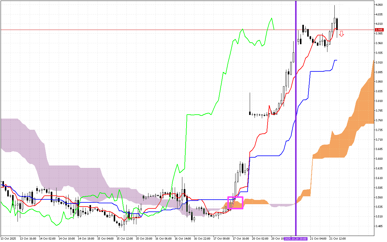 Το δεύτερο πιο σημαντικό σήμα είναι μια αλλαγή στην κατεύθυνση κίνησης του νέφους Kumo. Αυτό το σήμα σημειώνεται στο γράφημα με μια κατακόρυφη μωβ γραμμή. Το πορτοκαλί χρώμα του σύννεφου υποδηλώνει αλλαγή στην κατεύθυνση προτεραιότητας της κίνησης προς τα πάνω.