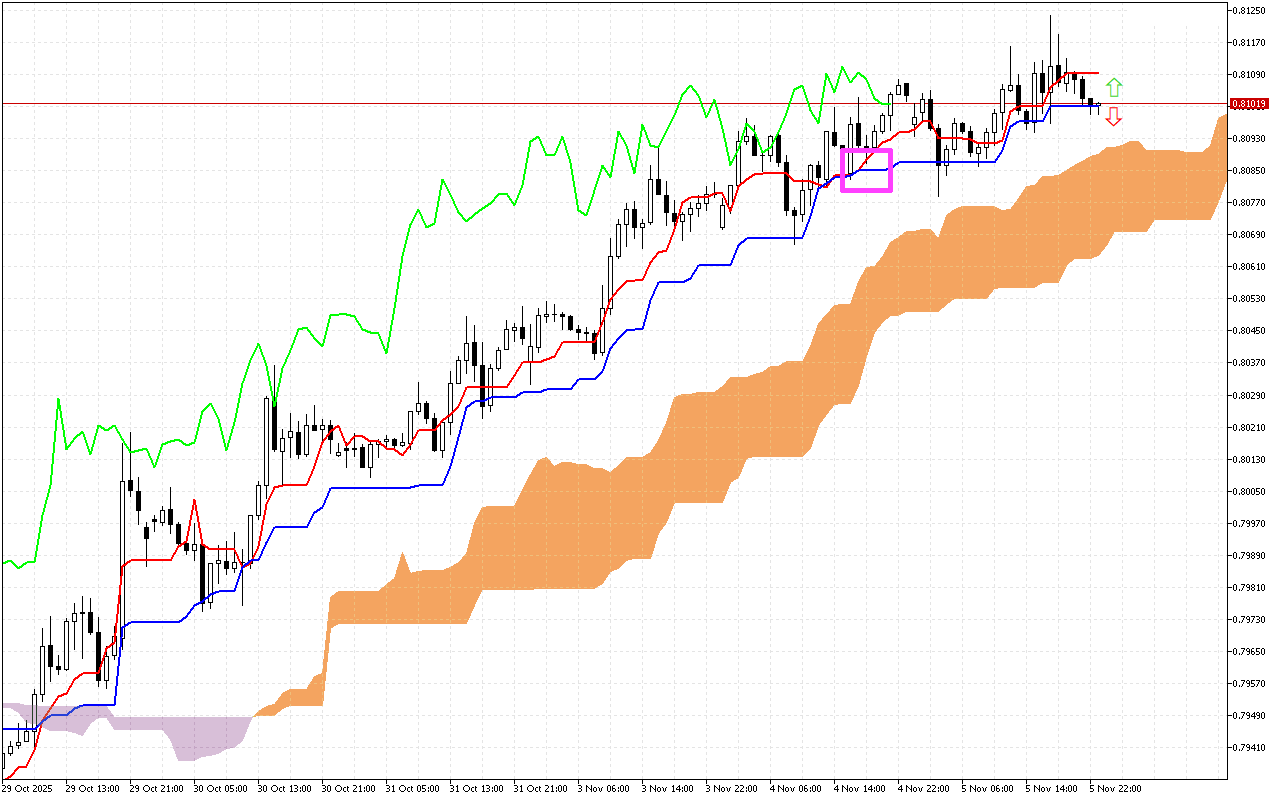 Ένα από τα κύρια σημάδια προηγούμενων συνεδριάσεων συναλλαγών ήταν η τομή των γραμμών Tenkan και Kijun. Αυτή η τοποθεσία επισημαίνεται με ένα ροζ τετράγωνο στο γράφημα. Μια άνοδος στη γραμμή Tenkan πάνω από το Kijun είναι ένα θετικό μήνυμα, το οποίο μπορεί να υποδεικνύει μια πιθανή αλλαγή της τάσης σε ανοδική.