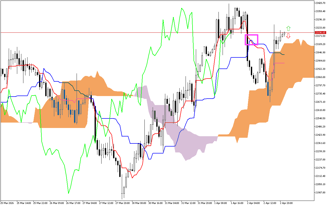 Ένα από τα κύρια σημάδια προηγούμενων συνεδριάσεων συναλλαγών ήταν η τομή των γραμμών Tenkan και Kijun. Αυτή η τοποθεσία επισημαίνεται με ένα ροζ τετράγωνο στο γράφημα. Μια άνοδος στη γραμμή Tenkan πάνω από το Kijun είναι ένα θετικό μήνυμα, το οποίο μπορεί να υποδεικνύει μια πιθανή αλλαγή της τάσης σε ανοδική.