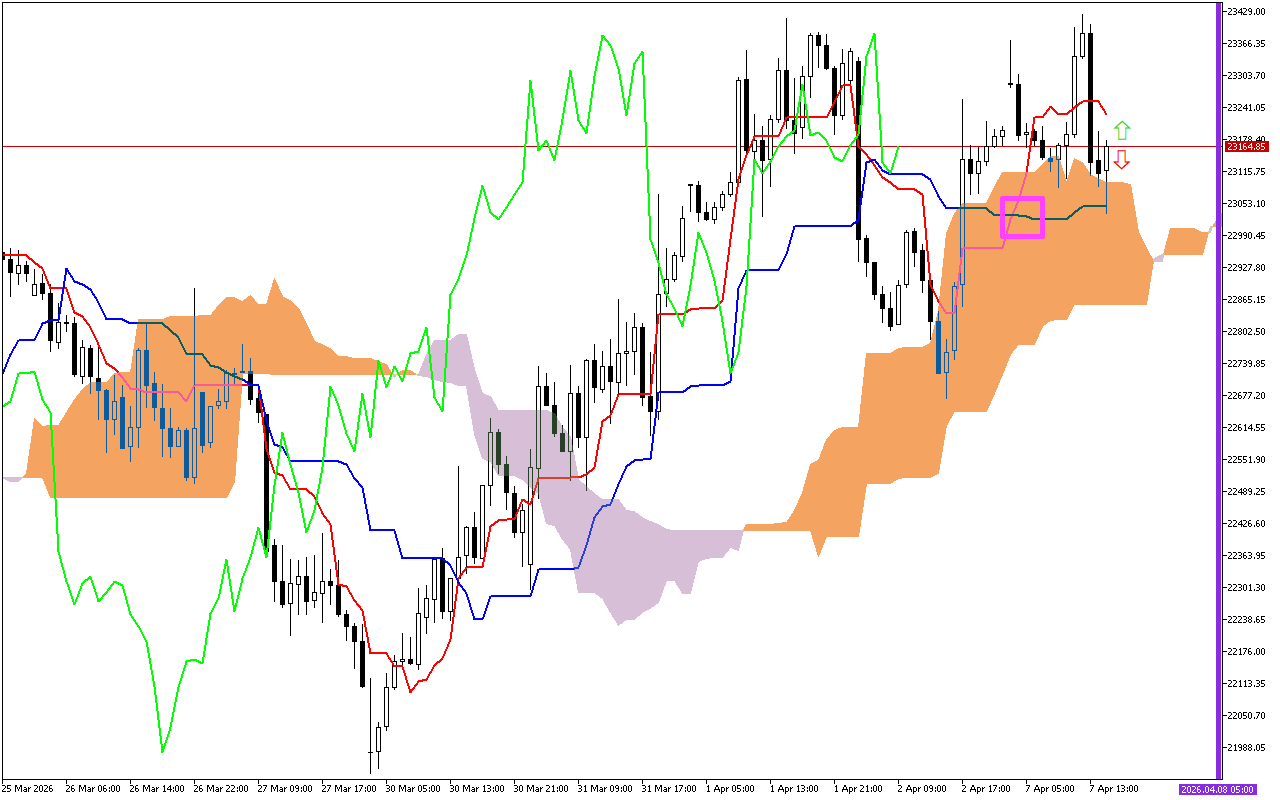 Η τιμή εισήλθε στο σύννεφο Kumo, που μπορεί να υποδηλώνει μια πιθανή αλλαγή στην τάση ή την ανάπτυξη μιας πλάγιας κίνησης. Οι γραμμές SenkouA και SenkouB λειτουργούν ως υποστήριξη και αντίσταση. Για να διευκρινιστεί η κατάσταση, αξίζει η αναμονή μέχρι να διορθωθεί η τιμή εκτός του cloud.