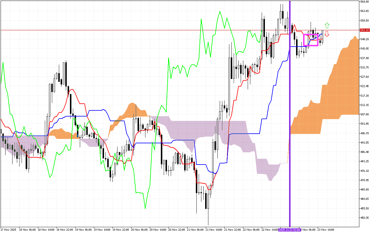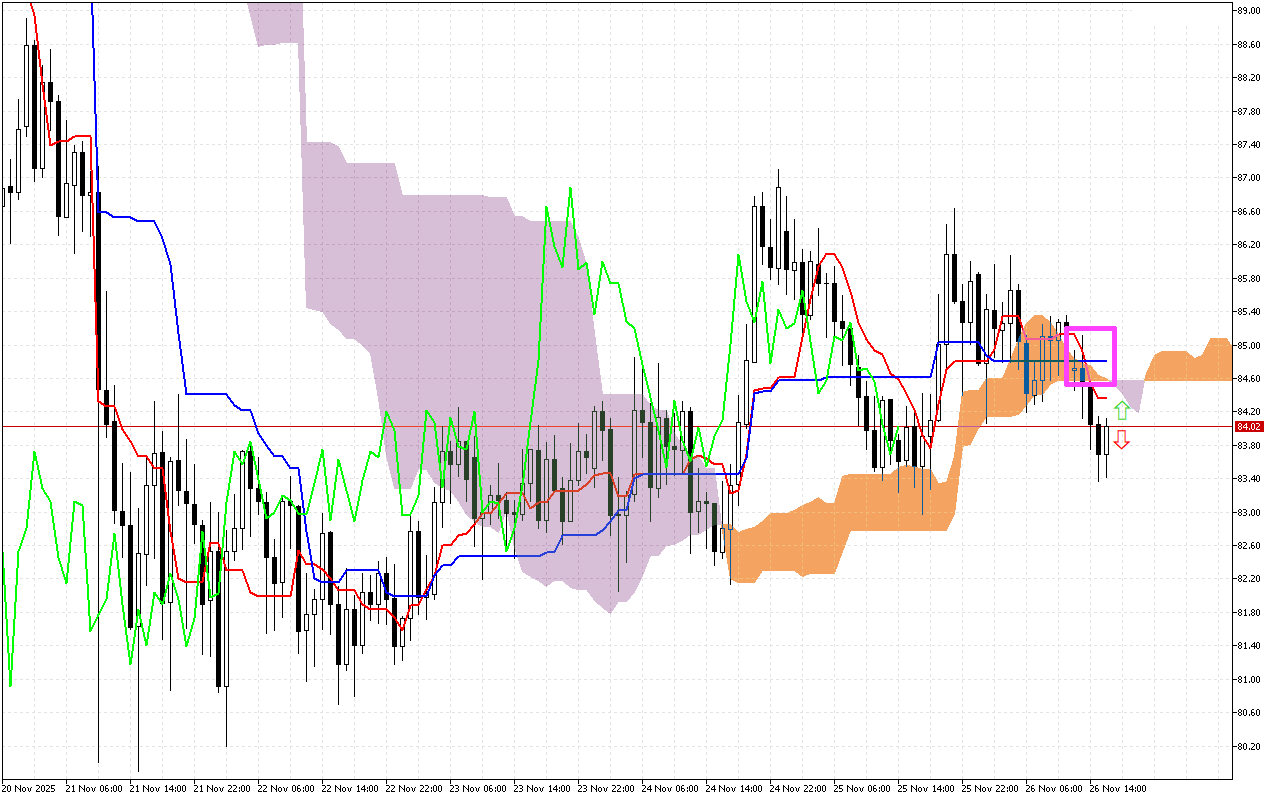 Στο τρέχον προφίλ της αγοράς, η τιμή έχει ενοποιηθεί κάτω από το νέφος Kumo. Τα όρια του νέφους σχηματίζουν μια ζώνη δυναμικής αντίστασης για την τιμή.