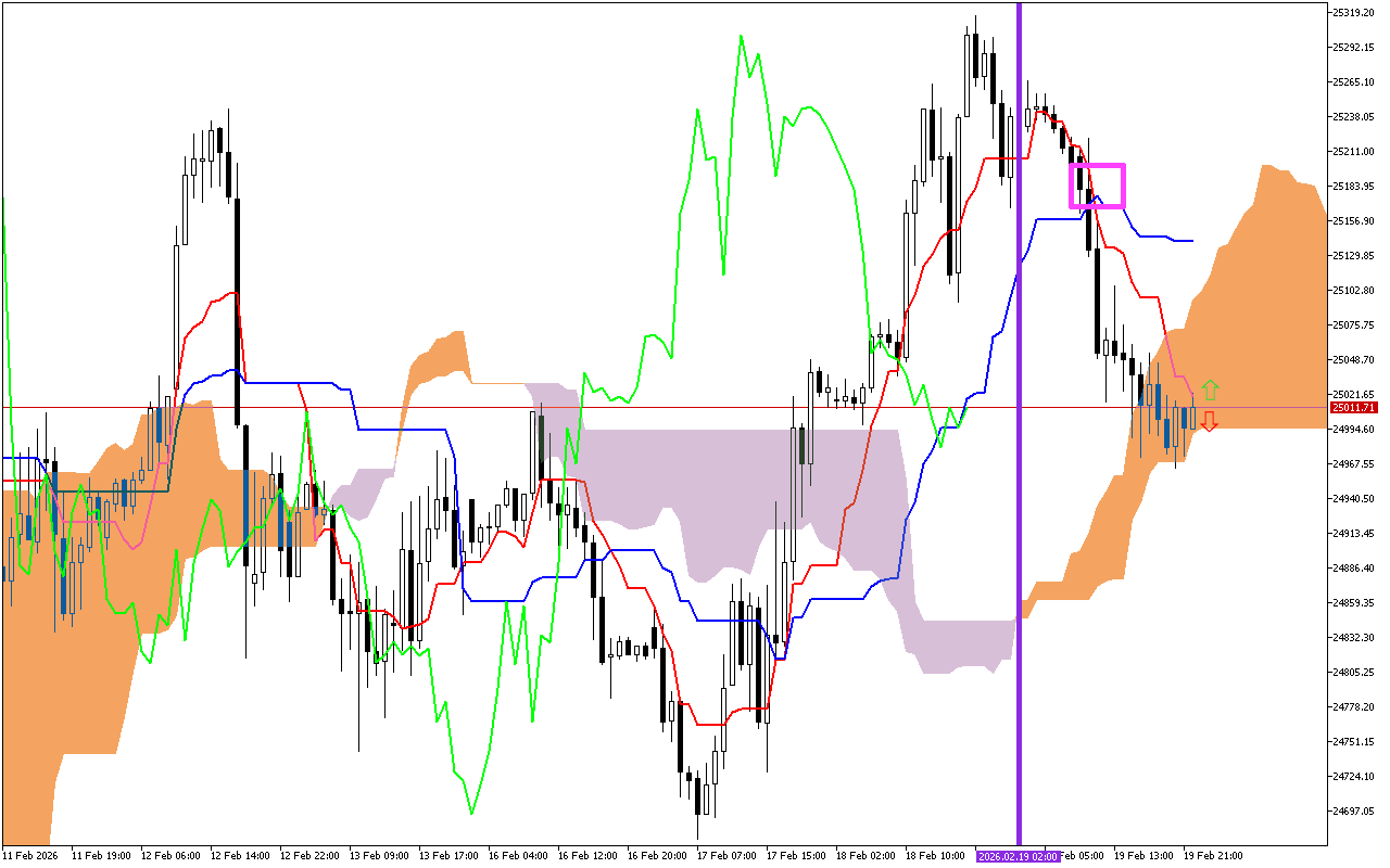Το κύριο σήμα των τελευταίων συνεδριάσεων συναλλαγών είναι η τομή των γραμμών Tenkan και Kijun, που σημειώνονται στο γράφημα με ένα ροζ τετράγωνο. Αυτό είναι αρνητικό σήμα. Υποδηλώνει μια αλλαγή της επερχόμενης τάσης σε πτωτική.