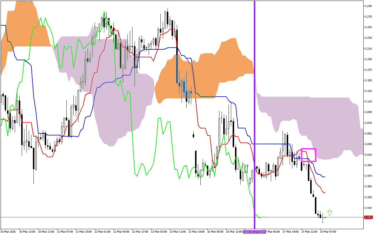 Παρατηρείται ένα σήμα τριών γραμμών στο γράφημα Natural Gas. Η τιμή είναι κάτω από την κόκκινη γραμμή Tenkan, την μπλε γραμμή Kijun και το σύννεφο Kumo. Αυτό το σήμα υποδεικνύει περαιτέρω ανάπτυξη μιας καθοδικής κίνησης.