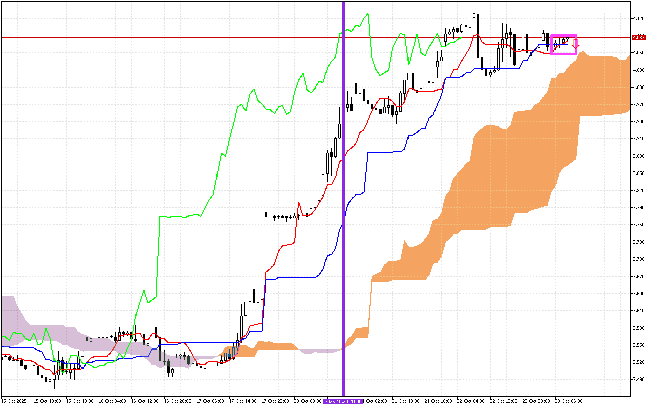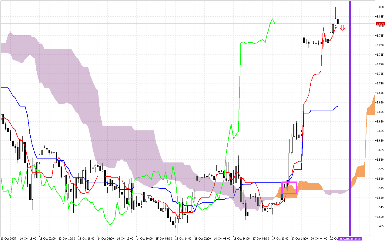 Το δεύτερο πιο σημαντικό σήμα είναι η αλλαγή κατεύθυνσης του νέφους Kumo, που σημειώνεται με μια κατακόρυφη μωβ γραμμή. Μια αλλαγή στο χρώμα του σύννεφου σε λιλά υποδηλώνει μια μετάβαση της κατεύθυνσης προτεραιότητας της κίνησης προς τα κάτω.