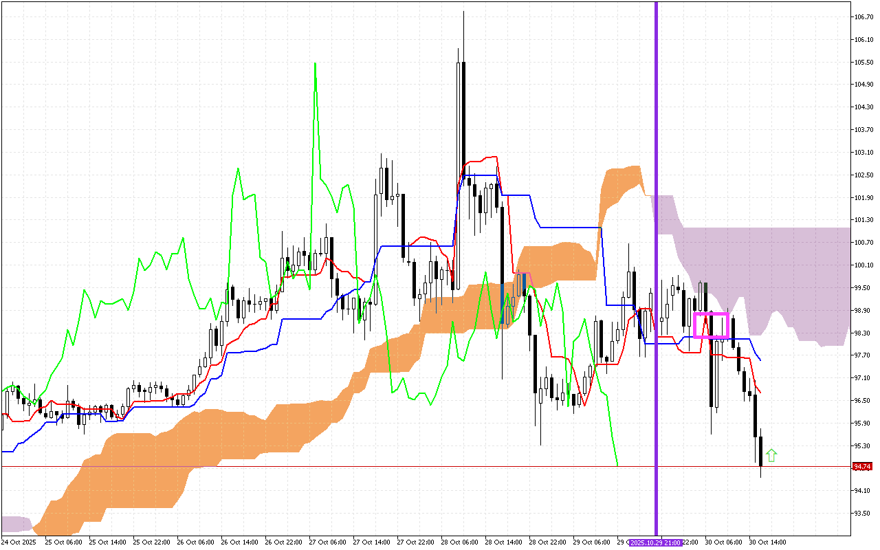Το σύννεφο Kumo είναι χρωματισμένο λιλά, το οποίο υποδεικνύει την προτεραιότητα του καθοδικού διανύσματος της κίνησης των τιμών.