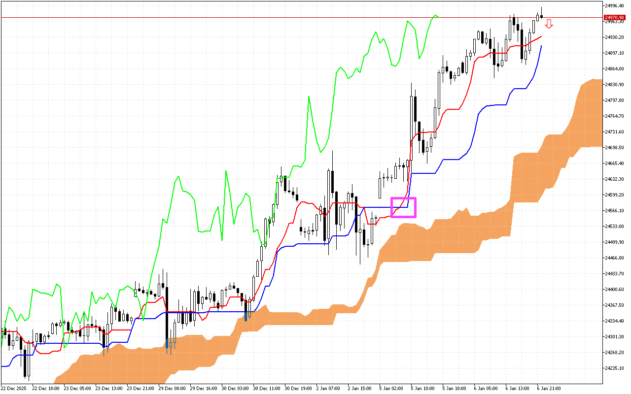 Η γραμμή Chikou, η οποία προβάλλει την τιμή κλεισίματος με μια καθυστέρηση 26 περιόδων, είναι πάνω από την τιμή.