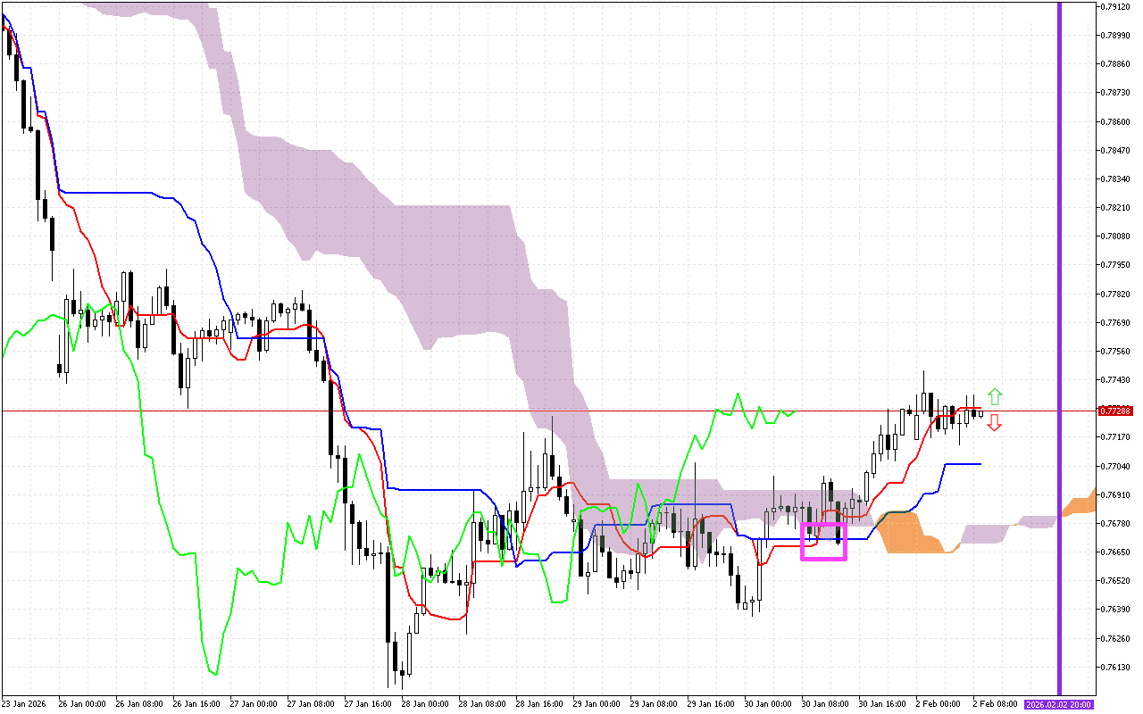 Τα επίπεδα δυναμικής αντίστασης βρίσκονται στη γραμμή Kijun, κοντά στο 0.77038, SenkouA, στα 0.77336 και SenkouB, κοντά στο 0.77312.