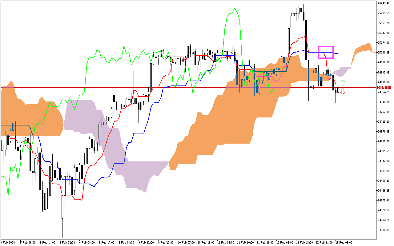 Η κύρια στιγμή των προηγούμενων συνεδριάσεων συναλλαγών ήταν η διασταύρωση των γραμμών Tenkan και Kijun. Αυτό το σήμα σημειώνεται στο γράφημα με ένα ροζ τετράγωνο και υποδηλώνει μια αλλαγή της τάσης σε πτωτική. Ωστόσο, στη συνέχεια είδαμε την τιμή να αυξάνεται πάνω από το Tenkan, υποδηλώνοντας αδυναμία στην καθοδική δυναμική.