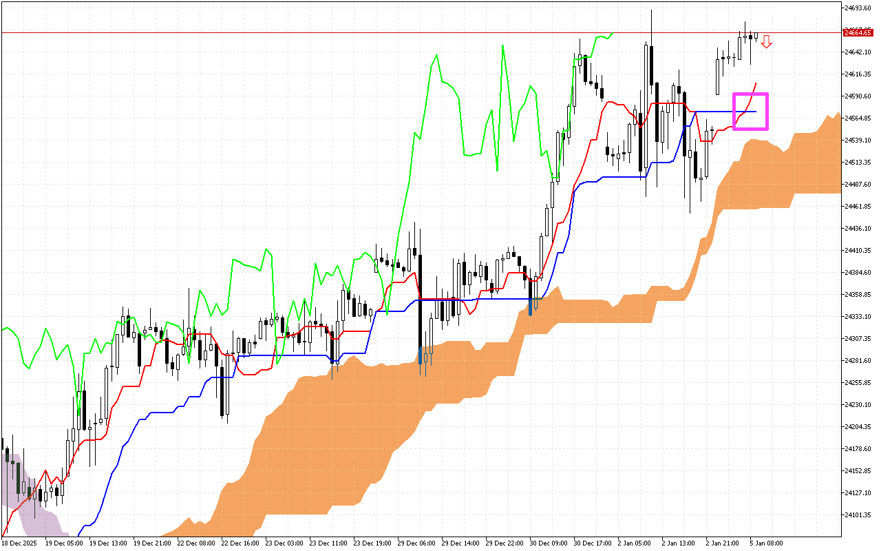 Στο τρέχον προφίλ της αγοράς, η τιμή έχει ενοποιηθεί κάτω από το νέφος Kumo. Τα όρια του νέφους σχηματίζουν μια ζώνη δυναμικής αντίστασης για την τιμή.