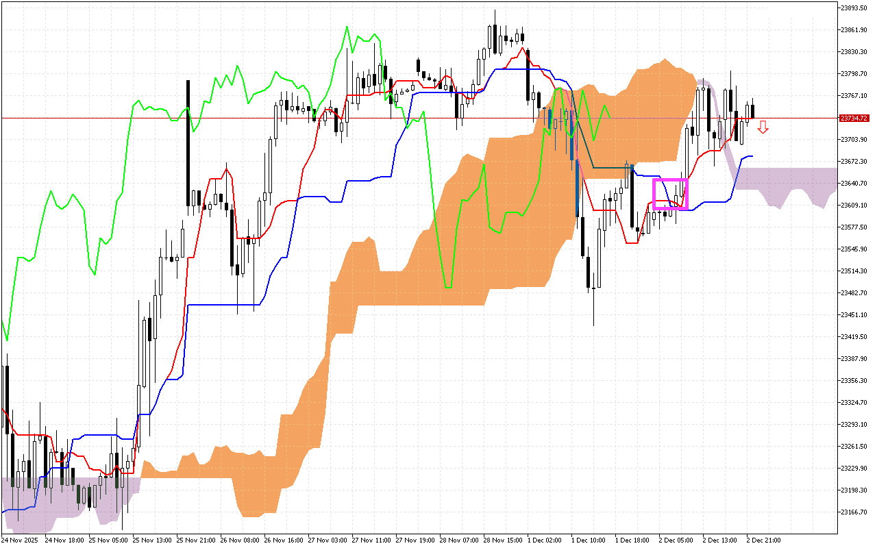 Η τιμή είναι κάτω από τις γραμμές Tenkan και Kijun, υποδεικνύοντας την επικράτηση της καθοδικής πίεσης.