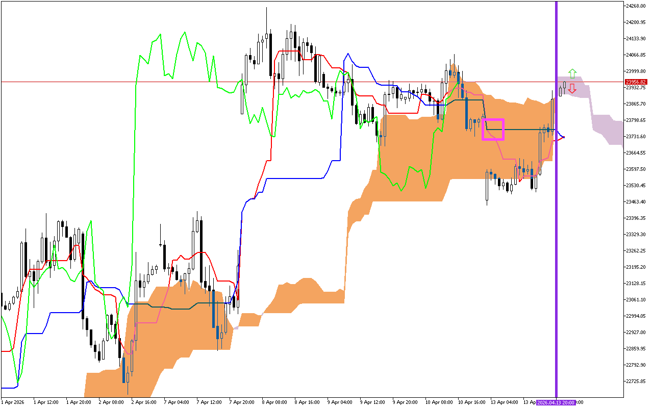 Τα δυναμικά επίπεδα υποστήριξης βρίσκονται στη γραμμή Tenkan, γύρω από το 23720.74, τη γραμμή SenkouA, στις γραμμές 23904.60 και SenkouB, γύρω στο 23976.56.