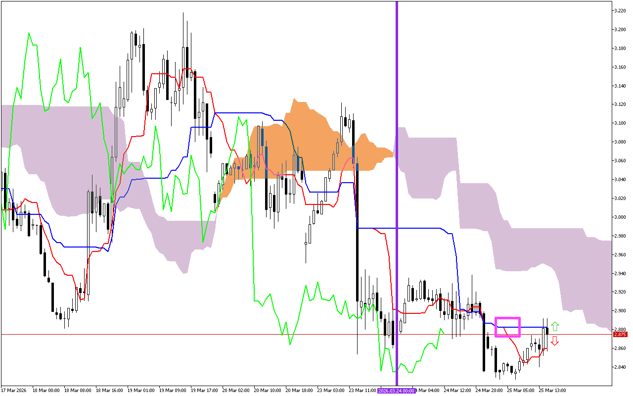 Το δεύτερο πιο σημαντικό σήμα είναι η αλλαγή κατεύθυνσης του νέφους Kumo, που σημειώνεται με μια κατακόρυφη μωβ γραμμή. Μια αλλαγή στο χρώμα του σύννεφου σε λιλά υποδηλώνει μια μετάβαση της κατεύθυνσης προτεραιότητας της κίνησης προς τα κάτω.
