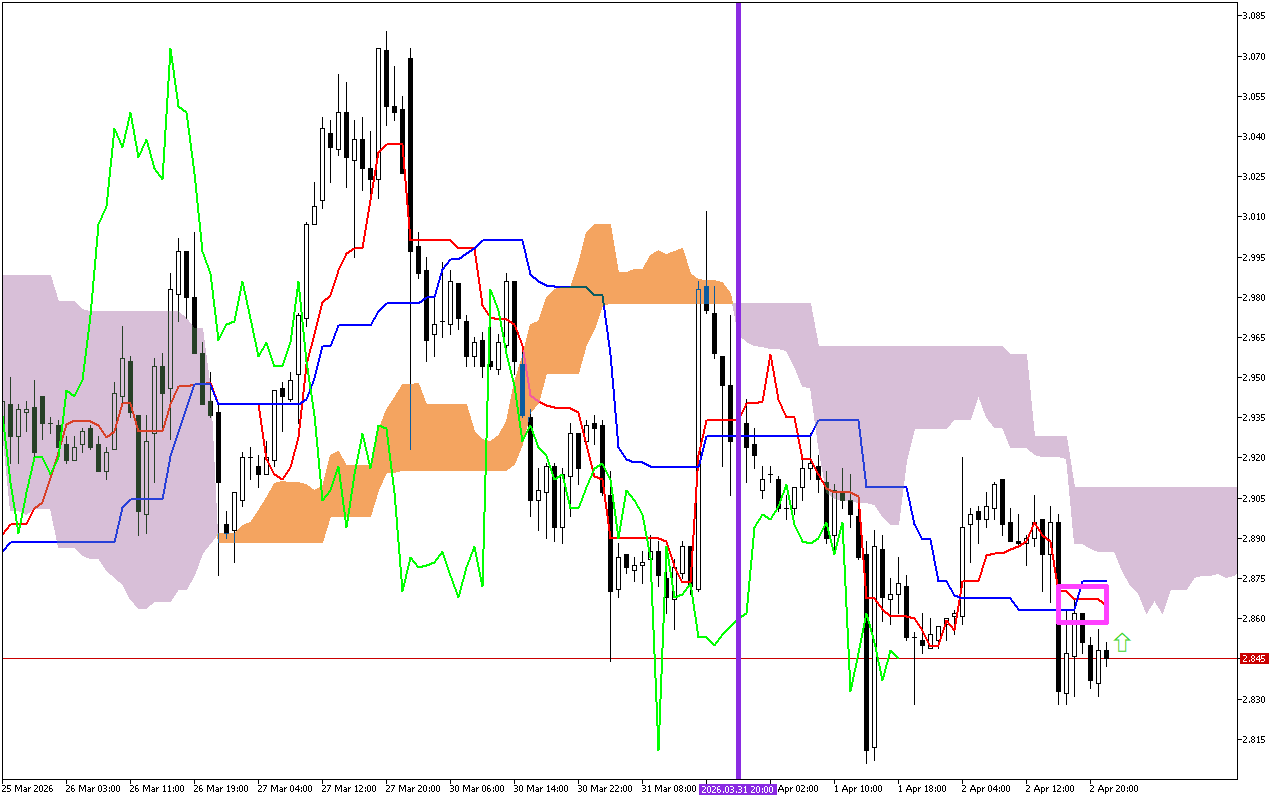 Το δεύτερο πιο σημαντικό σήμα είναι μια αλλαγή στην κατεύθυνση κίνησης του νέφους Kumo. Αυτό το σήμα σημειώνεται στο γράφημα με μια κατακόρυφη μωβ γραμμή. Το πορτοκαλί χρώμα του σύννεφου υποδηλώνει αλλαγή στην κατεύθυνση προτεραιότητας της κίνησης προς τα πάνω.