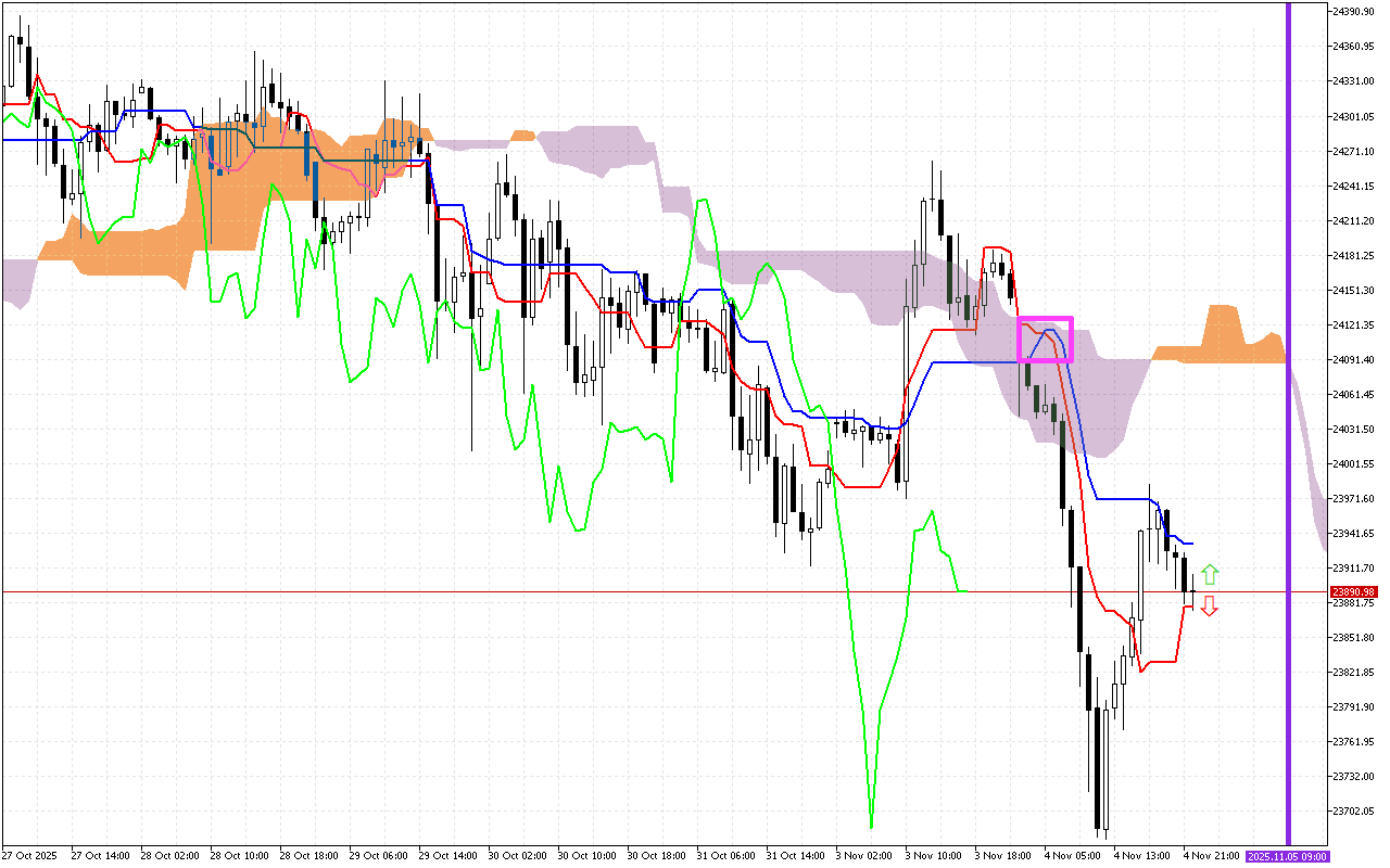 Το κύριο σήμα των τελευταίων συνεδριάσεων συναλλαγών είναι η τομή των γραμμών Tenkan και Kijun, που σημειώνονται στο γράφημα με ένα ροζ τετράγωνο. Αυτό είναι αρνητικό σήμα. Υποδηλώνει μια αλλαγή της επερχόμενης τάσης σε πτωτική.