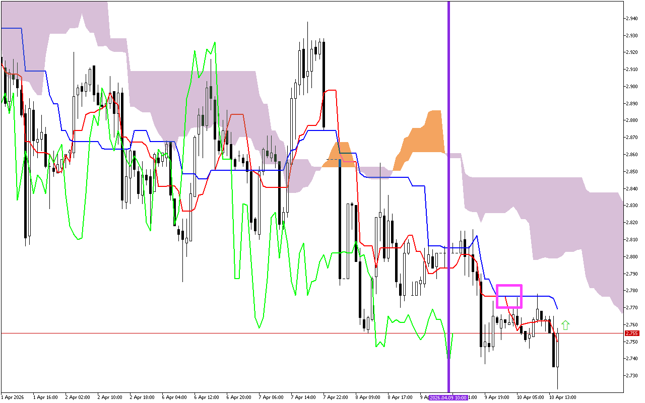 Το κύριο σήμα των τελευταίων συνεδριάσεων συναλλαγών είναι η τομή των γραμμών Tenkan και Kijun, που σημειώνονται στο γράφημα με ένα ροζ τετράγωνο. Αυτό είναι αρνητικό σήμα. Υποδηλώνει μια αλλαγή της επερχόμενης τάσης σε πτωτική.
