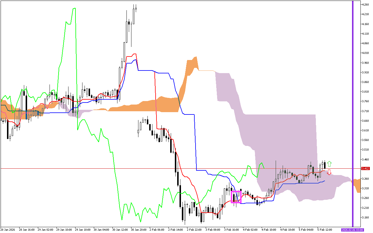 Κατά τη διάρκεια προηγούμενων συνεδριάσεων συναλλαγών, στο γράφημα Natural Gas παρατηρήθηκε η διασταύρωση των γραμμών Tenkan και Kijun, που σημειώνονται με ένα ροζ τετράγωνο. Αυτό το σήμα υποδεικνύει μια πιθανή αλλαγή στην πτωτική τάση.