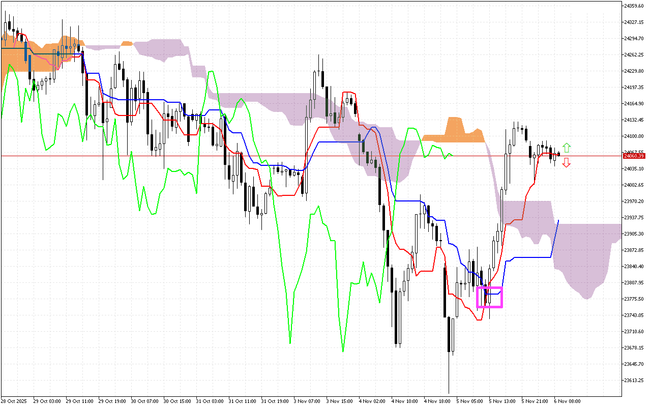 Die belangrikste oomblik van vorige handelssessies was die kruising van die Tenkan en Kijun lyne. Hierdie sein word op die grafiek met ‘n pienk vierkant gemerk en dui op ‘n verandering in die tendens na ‘n afwaartse een. Daarna is egter opgemerk dat die prys bo die Tenkan lyn gestyg het, wat dui op swakheid in die afwaartse momentum.