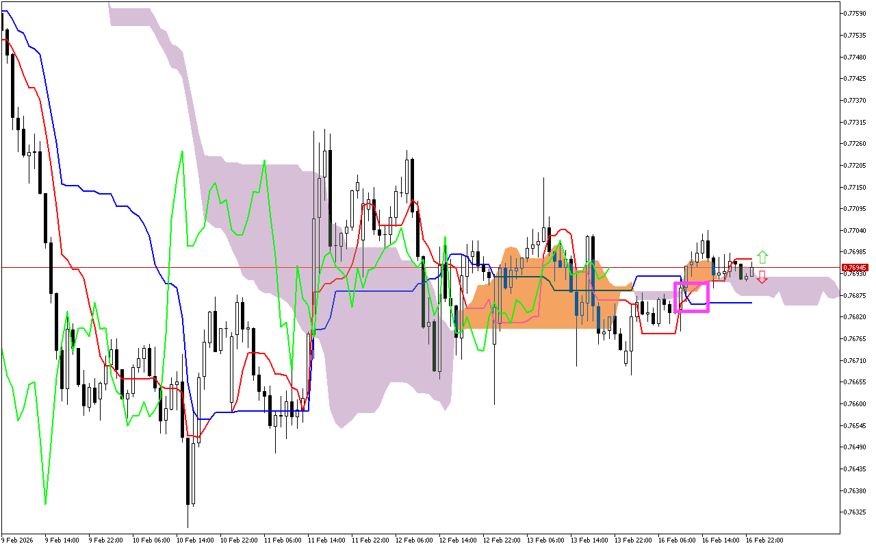 Die belangrikste oomblik van vorige handelssessies was die kruising van die Tenkan en Kijun lyne. Hierdie sein word op die grafiek met ‘n pienk vierkant gemerk en dui op ‘n verandering in die tendens na ‘n afwaartse een. Daarna is egter opgemerk dat die prys bo die Tenkan lyn gestyg het, wat dui op swakheid in die afwaartse momentum.