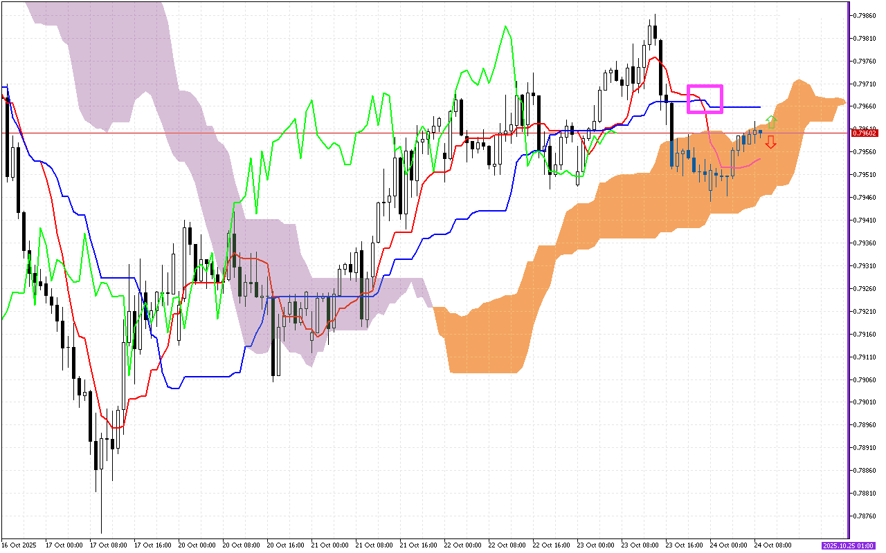 Die tweede belangrikste sein is die verandering in rigting van die Kumo-wolk, gemerk met ‘n vertikale pers lyn. ‘n Verandering in die kleur van die wolk na lila dui op ‘n oorgang van die prioriteitsrigting van beweging na afwaarts.
