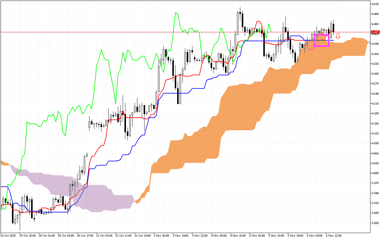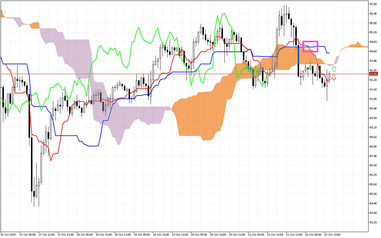 Die belangrikste sein van die vorige handelssessies was die kruising van die Tenkan en Kijun lyne, wat beskou word as ‘n sein van ‘n verandering in die tendens in die mark.
