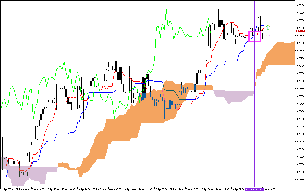 Dinamiese weerstandsvlakke is op die Tenkan-lyn, rondom die 0.78938-merk, en die Kijun-lyn, rondom die 0.78965-merk.