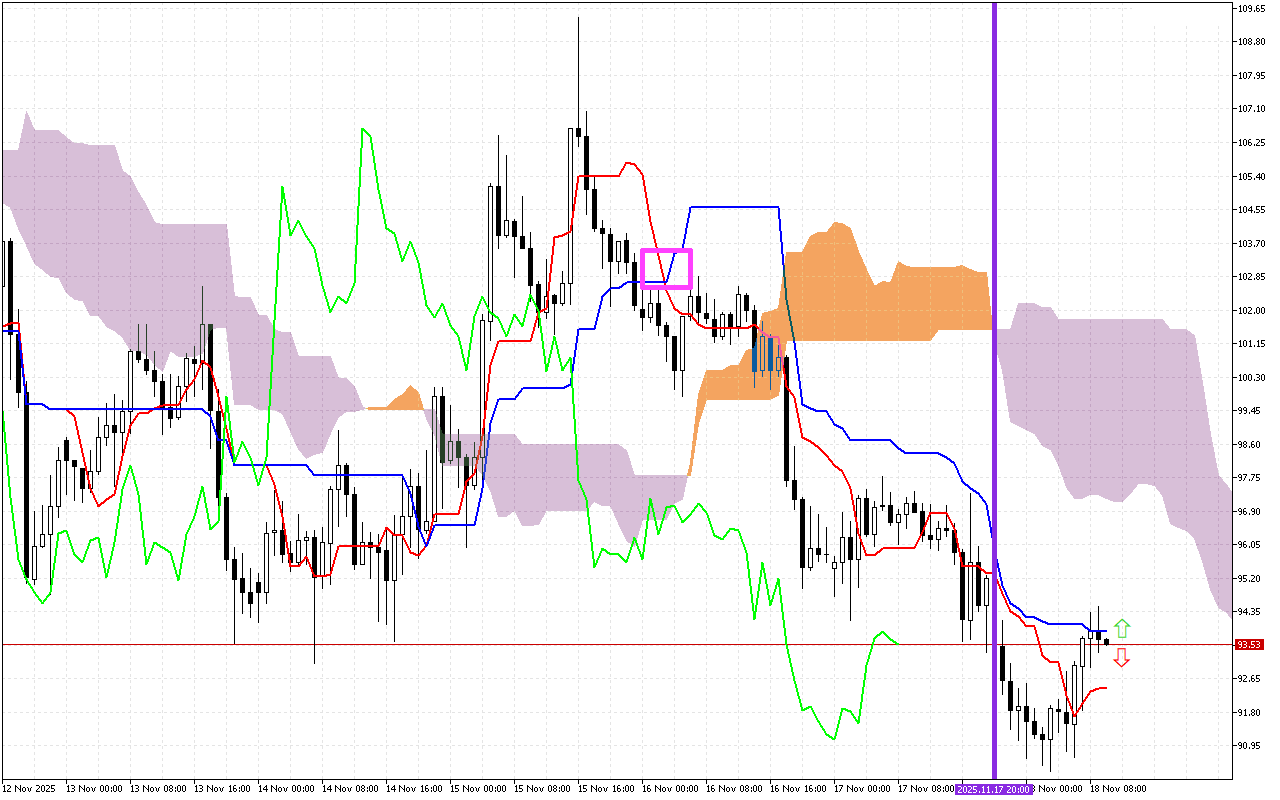 Die belangrikste sein van die vorige handelssessies was die kruising van die Tenkan en Kijun lyne, wat beskou word as ‘n sein van ‘n verandering in die tendens in die mark.
