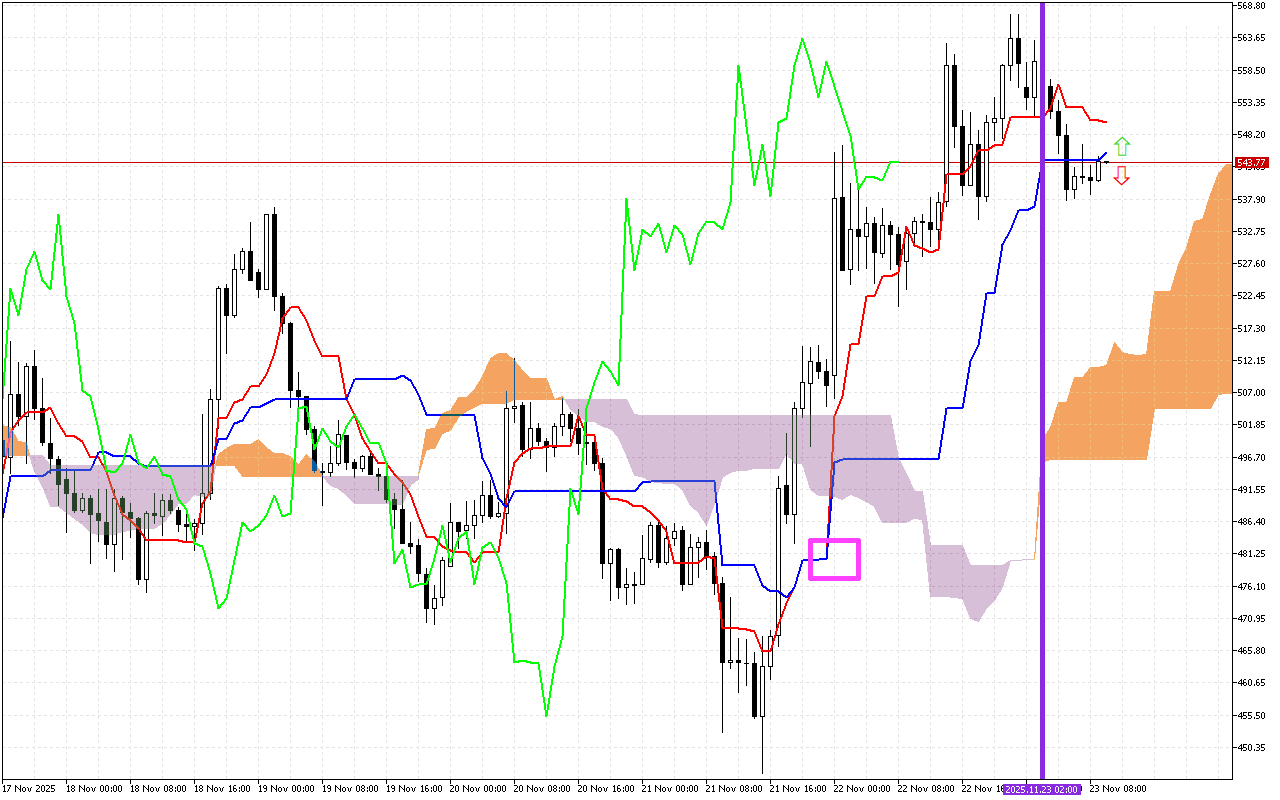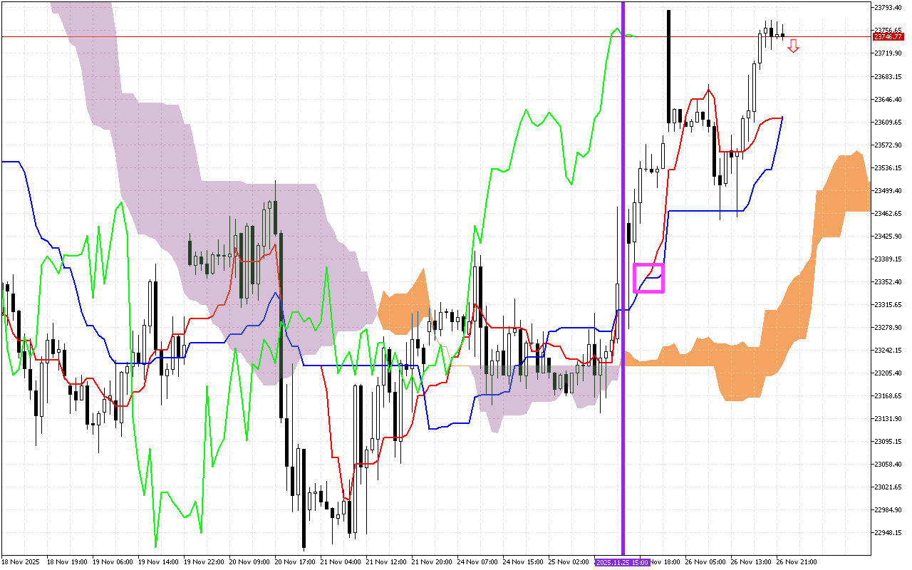 Die tweede belangrike sein is ‘n verandering in die bewegingsrigting van die Kumo-wolk. Hierdie verandering word met ‘n vertikale pers lyn op die grafiek gemerk. Die verskyning van oranje kleur in die wolk dui op ‘n verandering in die hoofrigting van beweging na opwaarts.
